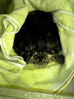 それで、今朝、お水を抜いてもらい、毎年恒例のバスタオル包みとなりました (^^)v
