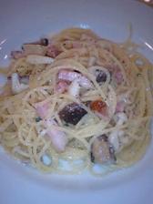 昨日に引き続き遅めのランチタイム‥お弁当は朝作ったパスタです。 ‥具はお母さんが作ったのですが、仕上げは自分で。 イカとアスパラとズッキーニのパスタはオイルベースで、ニンニクがしっかりスライスで入ってます。 イイ塩加減で美味しゅうございました♪(笑)