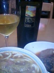 うどんの湯気でちょっとモヤッとしてる画像・・アツアツなカレーうどんにブリ大根、ワインは昨晩開けたピエトラカルダ。