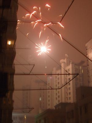 新年快樂!新年明けましておめでとうございます♪中国の農暦である、新年が明けました。昨日の午後から、爆竹の音が始まり夕方は更に花火が加わりいや~、すごかったですね~~・・。ピークは、夜の12時。右も左も、あっちもこっちも花火と、爆竹だらけで思わず興奮してしまいます。マンションの間に、花火の光がピカッ! ピカッ! っと光って戦争を体験したことはないのですが戦争とは、こんな感じなのかな・・と思わせるような感覚でした。↓花火は、マンションの中庭などで上げる人もいるのでマンションのビルに花火が当たったりでやたら窓なんか開けてられません。そもそも爆竹で大きな音を立てるのはお金の神様が降りて来てそれを祝う意味があるそうですが。明日も、あさっても、しばらく爆竹と花火は続きます。4日後の夜は、またお金にまつわる神様が降りて来るそうで今日のようなすさまじい爆竹と花火の音が鳴り響くそうです。夜の12時には、先日作った水餃子をダンナと食べました♪この水餃子を食べる意味は日本の年越しそばと同じだそうですが水餃子を食べるのは主に東北地方の人が中心だそうです。農暦2007年のスタートです。
