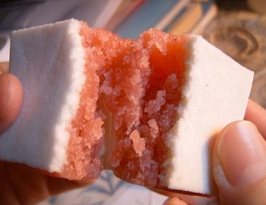 なんと言ったらいいんでしょうか・・?↓白いのは、ほのかに甘みがある白玉粉の味がします。間に挟まっている赤色の美味しそうな色は中国のお菓子では、よく使われるサンザシの実です。サンザシの実を、練って甘くしてのした白玉粉でサンドしてあるといったイメージでしょうか・・。サンザシの他には、緑豆とか、小豆とかがあります。甘ったるくないので、いくらでもいけそう。かなり甘さ控えめです。日本のお年寄りには好まれる味のような気がします。