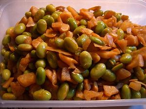 上海のお惣菜の種類はとっても豊富。中でも、食材を組み合わせたお惣菜はとってもおもしろいですね・・。↑これは、大根の漬物を細かく切って枝豆と炒めたもの。作り方は、フライパンに油をしき生の枝豆を油で炒めます。そして、少量の水を入れて、蒸し煮します。枝豆がやわらかくなったところで細かく切った大根の漬物を入れます。味付けは、大根の漬物の塩味が利いているので香り付けに、醤油を少しとチキンコンソメを振り入れて出来上がり♪箸休めに一役かう一品です。