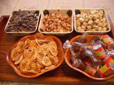 中国では、お茶を飲みながらお菓子や、果物を食べながら気の合う友人と、あるいは情報交換など時間をかけてゆっくり話をする習慣があります。上海では、中国各地の自分の気に入ったお茶を飲みながらくつろげる専門のお店があるほどです。このようなお店は、上海に限ったことではありませんが・・。Uさんのお家での交わりはいくつかのお菓子を用意してお茶を飲みながらお話をします。↓左上は、ひまわりの種。中央上は、ピーナッツ。右上は、ピスタチオ。左下は、乾燥バナナ。右下は、サンザシの実の練ったお菓子です。日本で言うところの、おせんべいを食べながらお茶を飲んで世間話をするといったところです。このようなスタイルは、中国の大手企業の会議室のテーブルでも見られる光景です。日本では、会議室にはフルーツやお菓子など置いてないですよね・・。でも中国では、これが一般的なスタイルなのです。