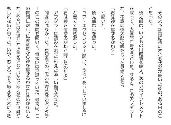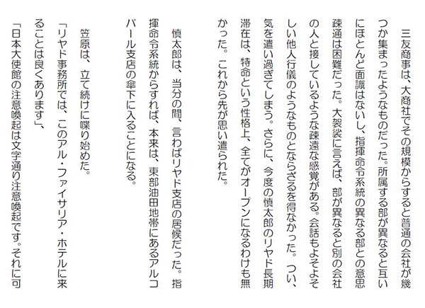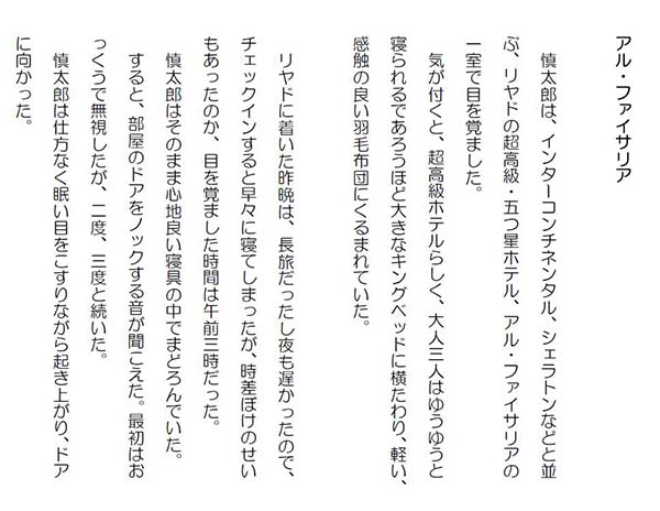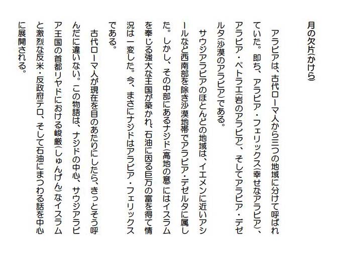 私のHPで、「目下、サウジアラビアを舞台にした、イスラム、原油価格暴騰がテーマの小説も執筆中。」と紹介させてもらっていたが、その素案をブログに掲載してみることにした。 取り敢えず、アサブロ「石油徒然草」にアップしてみたが、ここにも試しにアップしてみることにした。http://kappakawataro.asablo.jp/blog/?offset=5縦書きのスタイルを維持するために、JPEGのファイルを採用したので、見難くなるのではないかなど不安が多い。 内容より、そのようなファイル形式の選択などに時間がとられてしまったのは残念だ(笑い)。読みやすさを第一に、続けて行ってみたい。