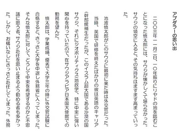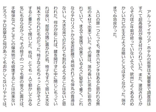 書いた原稿をPDFにして、更にそれをJPEGに変換して掲載するというのは、結構な手間だ。しかし、お陰さまで、見直して書き直すことが出来るというメリットもある。時には改悪になるかもしれないが(笑い)・・ 本日は、プロローグに続いて、第1章「アブダラーの思い出」をアップしたい。 うっかりしていたが、これはフィクションだから、フィクションとしてはお決まりの断り書きを次の通り添えさせて貰おう。 「この作品はフィクションであり実在の人物団体等とは一切関係ありません。」 それから、HPと同様に一応著作権も保持させて貰おう。 Copyright(C) 2008 Kazuo KAWAHARA All rights reserved 出来れば、少なくとも週に1回のペースで掲載して行きたいものだが・・・掲載方法は暫くは試行錯誤で読みやすさを追求してみたい。今回は試しに7ページ分を一緒にしてみた。しばし、ご不便ご容赦m(_ _)m