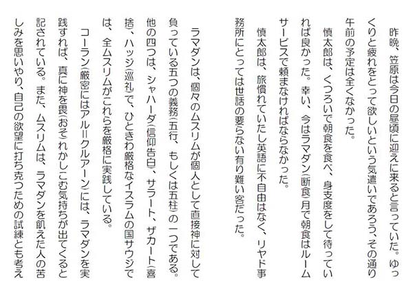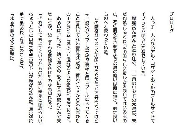ようやくプロローグまで掲載できた。正直言って疲れた。最初はこんなものか。 イスラムの基本はお祈りであり、それを知ってもらうために、最初にそのお祈りに人を集める呼びかけを紹介してみた。お祈りはモスレムのモスレムたる所以である六信五行の中に明示されている。 六信とは、アラー、預言者、天使、コーラン、来世、定命を信じることであり、五行とは、このお祈り、それに信仰告白、断食、喜捨、巡礼、を実践することである。これらをないがしろにするものはモスレムではない。サウジ人たりえない。 お祈りは一日に5回行なわれる。この呼びかけもその回数だけ行なわれ、それがイスラムの都市の特徴でもある。 私は、読み返してみると、あの一種独特な緊張感を鮮明に思い出すが、その気持ちを上手く表現出来ただろうか? リヤドではこのようなプールは一般的ではない。サウジ人で野外プールで泳ぐものなどいない。一流ホテルには室内プールが用意されているが、そこでもほんの一握りのサウジ人しか見かけない。 ここでは、それを敢えてイスラムに対するアンチテーゼとして使ってみた。サウジ人ほど信仰心が厚くないイブラヒムを最初に登場させたのも、そのためだ。イスラムの宗主国、厳格なイスラムの国でこれからイブラヒムがどのように生活して行くのか? これから主人公の一人である日本人が登場する。彼の目からみたイスラムとこのイブラヒムとの間にはギャップがあるのだろうか? イブラヒムはイスラムでは厳禁の先物トレーダーでもある。やがて、この二つ目の大きなテーマが絡み合って行くことになる。乞うご期待!
