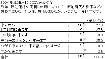100ドル時代はまた来るか?のアンケートに応えてもらってありがとう。まだまだ続けます。ぜひ、またの協力を! アンケートは面白い展開を見せている。原油価格が暴騰を続けているのに、100ドル時代が来ないという人のシェアが増えた。次の特色は、来ると言う人の中で一年以内に来るという人の数が増えている点だ。 その意味するところは、100ドル時代が来るなら早い、しかし100ドル時代が来ても長続きはしないということか?