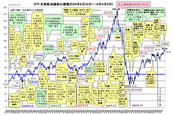 原油先物市場は、日本時間だと明日の朝7時までお休みだ。ちょっとゆっくりというところだが、先週末の暴落がどうなるのか見物だ。ゴールドマンサックスを初めとする旧大投資銀行は躍起となっていることだろう。 とにかく、儲けなければいけない会社だから、多少のあくどい事など平気のへいざいもんだ。いや多少ではないかもしれない。それが今度の提訴に繋がっている。 当のゴールドマンサックスは法的に全く問題なかったなどとコメントしたらしいが、「儲けて何が悪い」と言った御仁と似通ったもんだ。困ったことだ。持続的成長にはやはり道義というか倫理感が是非とも必要だろう。 ところで、いつもの原油価格の推移を表した図を作成してみた。これからすると、どうみても投機の影響が強いと言わざるを得ないのだが・・・ 毎度、細かな図で申し訳ない。 こちらならもう少し見やすいと思うので、是非! http://www.ne.jp/asahi/kappa/kawataro/info.html ブログ人気ランキングに参加しています。クリックよろしく アンケート、「100ドル原油時代はまた来るか?」に、ぜひ投票のほどを! http://blog.with2.net/vote/?m=v&id=17487