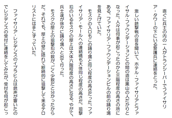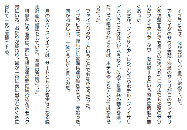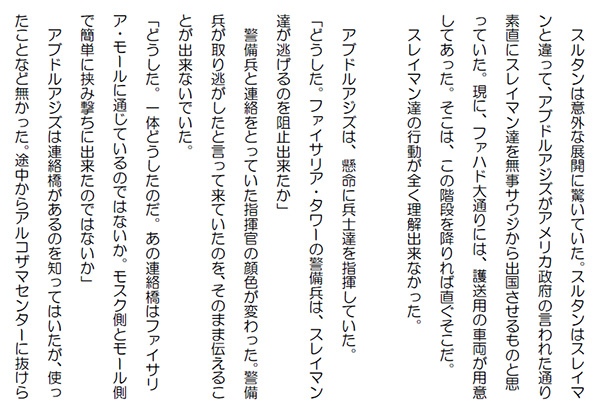 この作品はフィクションであり実在の人物団体等とは一切関係ありません。Copyright(C) 2008-2010 Kazuo KAWAHARA All rights reserved. 「今日はご苦労。アハマドは無事そちらの思う通りのところに運ばせてもらうから、スレイマンに希望を聞いてくれるか」 アブドルアジズは、月の欠片・スレイマンと直接話しをするのではなくアルバハのシェイク家の総領・スルタンと話すのを選択した。「分かりました。それでは、聞いて参りましょう」 スルタンは、アハマドとアラブ式の抱擁を終えたばかりのスレイマンのところに行って、アブドルアジズの言ったことを伝えた。 スレイマンは、ちらっとアブドルアジズの方を見ると、軽く会釈をして、何やらスルタンに囁いた。スルタンは、にこっと笑うと、スレイマンのところを離れ、アブドルアジズのところに戻って来た。 アブドルアジズは、それを聞くと、スレイマンの方を見て頷いた。 アブドルアジズは、スルタンとともにファイサル・ファウンデーション・ビルの玄関へと向かった。 表の兵士達が自動小銃を握り締めて、列を成しているのが見えた。アブドルアジズの姿が玄関に見えると、兵士達は、一斉に敬礼をして銃を構え直した。 アブドルアジズは、その列の間をスルタンとともに歩き出した。兵士達は一様に緊張感を漂わせていた。 ファンデーションの玄関から本の形をした高いビルの間は僅かな距離だ。アブドルアジズとスルタンは既に兵士達の作った列の半分は通過した。 スレイマン、サード、アハマド達が続いて玄関を出た時には、アブドルアジズとスルタンは、ほぼ高いビルのエントランスに入ろうとしていた。 アブドルアジズがスルタンと談笑しながら、エントランスに入り、後ろを振り返った時だった。スレイマン達は急に向きを変え、モスクの方へと走り出した。あっと言う間のことだった。 ファウンデーションのビルに最も近い兵士がアハマド達を呼び戻そうと声を発したのと、モスクの屋上から、ダダダダッと機銃掃射の凄まじい音がしたのとは、ほぼ同時だった。銃声が響き、列を成していた兵士達は、モスクの屋上を見上げる暇も無く皆鮮血を噴出しながら、そこに倒れて行った。 アブドルアジズとスルタンはビルの入口に伏せた。ビルの中にいた警備兵が扉を占め、モスクの屋上に向かって銃を構えた。あっと言う間に、アブドルアジズの前には兵士が壁を作り、アブドルアジズを守った。「何をしている。わしは良い。それよりもスレイマンを追え。必ず捕まえろ。逃がすでないぞ」 アブドルアジズは必死に怒鳴った。 言われて、一人の警備兵が入口を飛び出した。 すると、モスクの屋上から銃声がして、その警備兵も血を噴出してそこに倒れた。今度は、数名の警備兵が表に飛び出して行った。モスクの屋上との交戦が始まった。 アブドルアジズには、スレイマン達がファイサリア・モールへの連絡橋を走って行くのが見えた。「直ぐにファイサリア・タワーの警備兵に連絡して連絡橋を封鎖させろ」 アブドルアジズは全身の力を振り絞って叫んだ。人気ブログランキングに参加しています。クリックのほどよろしく