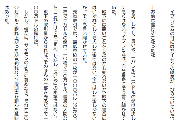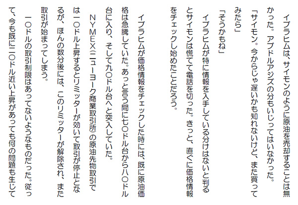 この作品はフィクションであり実在の人物団体等とは一切関係ありません。Copyright(C) 2008-2010 Kazuo KAWAHARA All rights reserved. イブラヒムは、サイモンのように原油を売却することは無かった。アブドルアジズの分もいじってはいなかった。「サイモン。今からじゃ遅いかも知れないけど、また買ってみたら」「そうかもね」 イブラヒムが特に情報を入手している分けはないと判るとサイモンは慌てて電話を切った。きっと、直ぐに価格情報をチェックし始めたことだろう。 イブラヒムが価格情報をチェックした時には、既に原油価格は急騰していた。あっと言う間に70ドル台から80ドル台に入り、そして90ドル台へと突入していた。 NYMEX(ニューヨーク商業取引所)の原油先物取引では10ドル上昇するとリミッターが効いて取引が停止となるが、ほんの数分後には、このリミッターが解除され、また取引が始まってしまう。 10ドルの取引制限はあってないようなものだった。従って、今も既に20ドル近い上昇があっても何の問題も生じていない。急騰の原因は世界最大の原油輸出国・サウジアラビアでテロリストが銃撃戦を展開したという報道だった。とにかく、サウジアラビアの政治不安は、イランなど比較にならないほどのインパクトがある。 しかも、今回は兵士が血を流して横たわっている写真まで流された。何が起きたか分からなかったが、それが却って不安を高めた。 イブラヒムは、原油価格は直ぐに100ドルを超えるだろうと思っていた。アメリカでは、原油在庫が減少するのではないかという予測が出されていたから尚更だ。イブラヒムは、その原油在庫減少は、先週、ハリケーンの影響で原油輸入が減少したから当然の結果だし、まだまだ在庫水準は高いとは思っていたが、投機筋は、そうは考えない。何しろ、強気要因を探すのは天才的だ。 しかも、アメリカは、既にハリケーンシーズンに入った。俄かに、行け行けどんどんとなって来ていた。 スレイマン達は、必死でアルコザマセンター内を走っていた。全て、計画通りの行動だった。 ファイサリア・タワーの警備兵が連絡橋にかけ寄って来た時には、既に大王の香水師の店の前まで来ていた。胸の高さまである大きな香炉からはマーモールの煙が立ち上がり、辺りに芳香を漂わせていた。 その脇を走り抜ければ、直ぐに螺旋階段だ。三人はそこを一気に駆け抜ける。 オレイヤ通りに面した入口では、沙漠のサソリのメンバーが手を振って、螺旋階段を駆け下りてくる三人に合図をしていた。 ファイサリア・タワーから駆けつけた警備兵が、吹き抜けのかなた向うに見える入口に自動小銃を向けた時には、既に三人の姿は玄関前に停車していた車の中に消えていた。 また、銃撃しようにも、玄関付近は大勢の人でごった返していた。 その警備兵はトランシーバーで盛んに連絡をとってはいたが、その車が急発進して行くのをただ見送るだけだった。 人気ブログランキングに参加しています。クリックのほどよろしく
