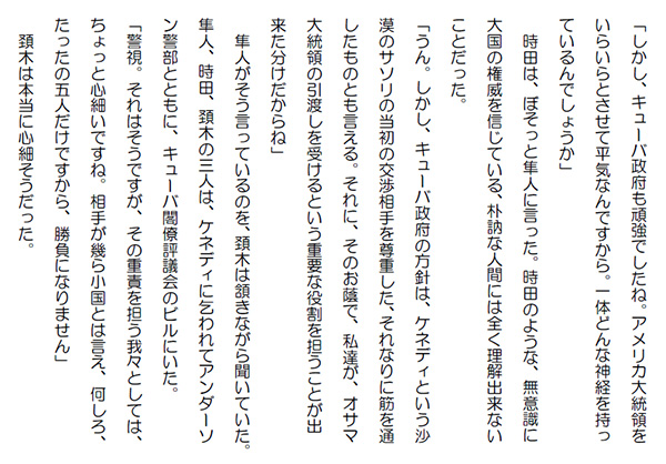 この作品はフィクションであり実在の人物団体等とは一切関係ありません。Copyright(C) 2008-2010 Kazuo KAWAHARA All rights reserved. 「しかし、キューバ政府も頑強でしたね。アメリカ大統領をいらいらとさせて平気なんですから。一体どんな神経を持っているんでしょうか」 時田は、ぼそっと隼人に言った。時田のような、無意識に大国の権威を信じている、朴訥な人間には全く理解出来ないことだった。「うん。しかし、キューバ政府の方針は、ケネディという沙漠のサソリの当初の交渉相手を尊重した、それなりに筋を通したものとも言える。それに、そのお蔭で、私達が、オサマ大統領の引渡しを受けるという重要な役割を担うことが出来た分けだからね」 隼人がそう言っているのを、頚木は頷きながら聞いていた。隼人、時田、頚木の三人は、ケネディに乞われてアンダーソン警部とともに、キューバ閣僚評議会のビルにいた。「警視。それはそうですが、その重責を担う我々としては、ちょっと心細いですね。相手が幾ら小国とは言え、何しろ、たったの五人だけですから、勝負になりません」 頚木は本当に心細そうだった。「まあ、それが先方の狙いでもあるんだろうね。我々は、何かあったら、ケネディ、それに何よりもオサマ大統領を死守しなければならない」 隼人は、そうは言ってはみたものの、自分達は、キューバ政府の掌の内にあることは正確に認識していた。必死で抵抗したところで、握り潰そうと思えば、いとも簡単なことだ。 隼人達は、キューバ政府が、約束通り、スムーズに引き渡しを進めてくれることを祈っていた。それには、アハマドの引渡しが問題無く、進められることが前提になる。「警視。こちらで何かあるとは思えませんが、リヤドで何も無いと良いですね」 頚木は、遠くリヤドの空を想っていた。「そうだね。そろそろ引き渡し時刻も近付いて来た。今頃、リヤドではマグレブのお祈りが終る頃だ」 イブラヒムは、ファイサリア・レジデンスの自室から相変わらず外を覗っていた。アブドルアジズからは、アハマドの引渡しに来ると聞いてはいたが、どうも、それにしてはものものしい動きだと訝しく思っていた。アブドルアジズが来るというだけでも警備は厳重だが、訪問先がファイサリア・ファウンデーションということであれば、このファイサリア・レジデンスまでものものしい動きになるようなことは、これまでには無かった。 すると、イブラヒムの携帯が鳴った。サイモンからの電話だった。「どうした。サイモン。さっき話したばかりなのに」 イブラヒムは、悪い予感がした。「サイモン。大変な極秘情報を入手した。さっき、お前は何も言っていなかったけど、アブドルアジズから何か聞いていないか」「えっ。一体何のこと」 イブラヒムは、アハマドの引渡しの件だと直感的に思ったが、とぼけてみた。自分から言いだす分けには行かない。「オサマが、アハマドと交換で解放されると言うのだ」「そう・・・」「そんなことになれば、原油価格は暴落だぞ」人気ブログランキングに参加しています。クリックのほどよろしく