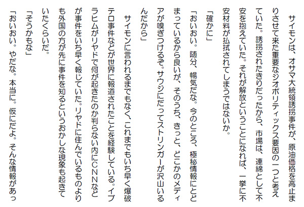 この作品はフィクションであり実在の人物団体等とは一切関係ありません。Copyright(C) 2008-2010 Kazuo KAWAHARA All rights reserved. サイモンは、オサマ大統領誘拐事件が、原油価格を高止まりさせて来た重要なジオポリティックス要因の一つと考えていた。誘拐されたきりだったから、市場は、連綿として不安を抱えていた。それが解放ということになれば、一挙に不安材料が払拭されてしまうではないか。「確かに」「おいおい。随分、暢気だな。今のところ、極秘情報にとどまっているから良いが、そのうち、きっと、どこかのメディアが嗅ぎつけるぞ。サウジにだってストリンガーが沢山いるんだから」 サイモンに言われるまでもなく、これまでもいち早く爆破テロ事件などが世界に報道されたことを経験している。イブラヒムがリヤドで何が起きたのか判らない内にCNNなどが事件をいち早く報じていた。リヤドに住んでいるものよりも外国の方が先に事件を知るというおかしな現象も起きていたくらいだ。「そうかもな」「おいおい。やだな。本当に。仮にだよ。そんな情報があったら、直ぐに連絡してもらわないと。大損を出してからじゃ遅いからな」 サイモンは仮にと言ってはみたが、イブラヒムが極秘情報を入手していた可能性は高いと思っていた。「済まん。サイモン。その情報は確かだ。殿下から以前に聞いていた」 イブラヒムは仕方なく、そう言った。「ええっ。それじゃ、直ぐに売り抜かないと。イブラヒム、勘弁してよ。こう言うことは早めに言ってもらわないと。まあ、でも、アブドルアジズ殿下から釘を刺されていたんだろうから仕方ないか。とにかく、今はお前に文句を言っている暇は無い。直ぐに行動を起こさないと。それじゃ、またな」 サイモンは俄かに忙しくなってあたふたとしていた。 ファイサリア・ファウンデーションのビルの一室では、月の欠片・スレイマン達とアハマドが顔を合わせていた。アハマドはいよいよもう直ぐ自由の身かと思うと、わくわくして来るのを堪え切れなかった。スレイマン達は、そんなアハマドの気持ちを察していた。スレイマン達とアハマドは、アラブ式の抱擁をしていた。アハマドの目には涙が溢れていた。アブドルアジズは、その光景を、もうすぐその全員を再拘束してやると思いながら眺めていた。「スルタン。久しぶりだな。元気そうじゃないか」 アブドラアジズは、スレイマン達とは一歩下がって立っていたスルタンに向かって言った。ここにスルタンとスレイマンが一緒に居ることに満足していた。もともと、アブドルアジズがスルタンにスレイマンの手助けをするように依頼していたので、スルタンがその言葉通りに、こうしてスレイマンと一緒にいるからだった。全てアブドルアジズの筋書き通りだ。沙漠のサソリの手助けをしたスルタンを拘束することには正当性がある。そうなれば、アルバハのシェイク家の未来はない。「お久し振りです。殿下もお元気そうで何よりです」アブドルアジズは、満足気に頷いた。 人気ブログランキングに参加しています。クリックのほどよろしく