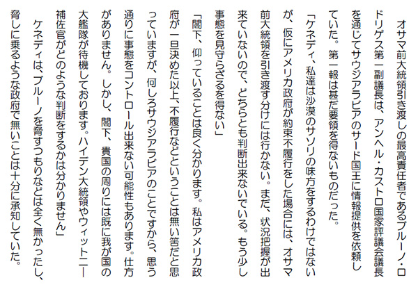 この作品はフィクションであり実在の人物団体等とは一切関係ありません。Copyright(C) 2008-2010 Kazuo KAWAHARA All rights reserved. オサマ前大統領引き渡しの最高責任者であるブルーノ・ロドリゲス第一副議長は、アンヘル・カストロ国家評議会議長を通じてサウジアラビアのサード国王に情報提供を依頼していた。第一報は甚だ要領を得ないものだった。「ケネディ、私達は沙漠のサソリの味方をするわけではないが、仮にアメリカ政府が約束不履行をした場合には、オサマ前大統領を引き渡す分けには行かない。まだ、状況把握が出来ていないので、どちらとも判断出来ないでいる。もう少し事態を見守らざるを得ない」「閣下、仰っていることは良く分かります。私はアメリカ政府が一旦決めた以上、不履行などということは無い筈だと思っていますが、何しろサウジアラビアのことですから、思う通りに事態をコントロール出来ない可能性もあります。仕方がありません。しかし、閣下、貴国の周りには既に我が国の大艦隊が待機しております。ハイデン大統領やウィット二-補佐官がどのような判断をするかは分かりません」 ケネディは、ブルーノを脅すつもりなどは全く無かったし、脅しに乗るような政府で無いことは十分に承知していた。「ケネディ、その心配は無用だ。ハイデンもウィット二-も我々に対して何も出来はしない。今は、大国と言えども、国際社会の同意無しには何も出来ないのだ」 ブルーノは落ち着いていた。「しかし、万万が一、沙漠のサソリがオサマ前大統領に危害を加えるようなことがあれば・・・」「それを100%否定することは出来ないが、ここにいる沙漠のサソリ達は、言わば第二級の者達だ。自分達の判断では何も出来はしない」 確かに、ここにいる中では、幹部級はニューヨーク支部のファルーク・バルキンドくらいだった。場所柄、フロリダ支部のファルーク・フセイニ、アハマド、イザベルも来ていたが、スレイマン、サードの信頼が厚いとは思えない。「閣下の仰る通りかも知れませんが、仮に統領の月の欠片・スレイマンが殺害されたり、拘束されるようなことがあれば、彼等も何をするか分かりませんよ」「うん。そうかもしれんな。その意味ではオサマはライオンの檻に入っているようなものか」「閣下、是非、そんなことが無いようにお取り計らい願いたいですね」「ケネディ、わしにはそんなことは出来ない。お前が仮にというなら、わしも仮にと言わせてもらおう。仮にだ。サウジ政府が、これを機会にスレイマンを殺害したとしたら、わしは沙漠のサソリが何をしようが止めることは出来ん。いや、彼等から武器を取り上げている分けではないから、制止する前に殺害してしまうかもしれんて」 ブルーノもケネディを脅している分けではなかった。「閣下、申し訳ありませんでした。確かにそうですね。仮のことは話しても致し方ありません。一刻も早く、サウジ政府から正確な情報が届くのを、期待するより他ありませんね」 ケネディは、また、顔を曇らせ意気消沈していた。 ロンドンのサイモンは必死で原油を買い漁っていた。原油価格は見る見る内に上昇して行った。それを誰も止めることは出来ない。先物市場は火が着くと一気に燃え上がる。小さな事実が世界の資金を集めどんどんと増幅してしまうのだ。人気ブログランキングに参加しています。クリックのほどよろしく
