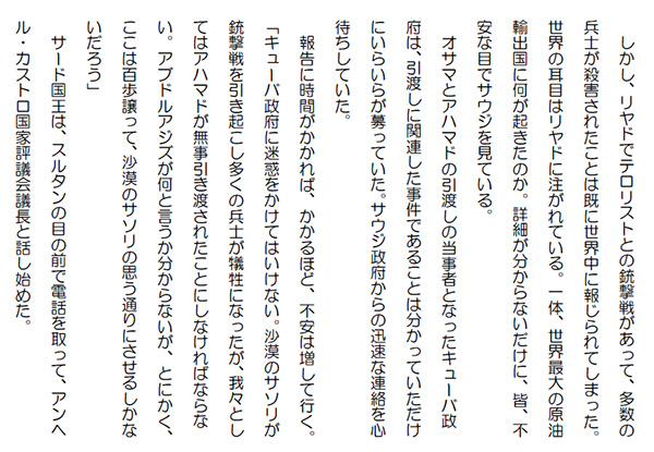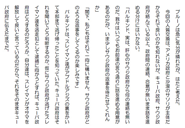 この作品はフィクションであり実在の人物団体等とは一切関係ありません。Copyright(C) 2008-2010 Kazuo KAWAHARA All rights reserved. ブルーノは急に気分が晴れたが、はたと考えた。 今回の人質交換は、アメリカ政府と沙漠のサソリが主体だからそれで良いのかも知れないが、キューバ政府、サウジ政府が絡んでいる以上、政府間の連絡、合意が無いまま話を進める分けにはいかない。「バルキンド、実は、肝心のサウジ政府から何の連絡も無いのだ。我々はいつでもお前達の言う通りに話を進める用意があるのだが、いま少しサウジ政府の返事を待たせてくれんか」「閣下、私どもはそれで一向に構いません。サウジ政府がどのような返事をしてくるのか楽しみです」 バルキンドは、スレイマン達がアブドルアジズの裏をかいて本部まで逃げ帰ったことを知っていた。キューバ政府はそれを聞いてどう判断するのか。仮にサウジ政府が逃げたスレイマン達を逃走犯として逮捕に向かうとすれば、キューバ政府はどうするのだろうか。自分達は、スレイマンがオサマを解放して良いと言っているのだから、それをそのままキューバ政府に伝えたまでだ。 あとは政府間で勝手に考えてくれと開き直っていた。「サウジ政府から返答があり次第、お前達に連絡する。私としてはサウジ政府がスムーズにことを運んでくれることを祈るばかりだ」 スルタンは久し振りにサード国王に謁見していた。サード国王は上機嫌でスルタンを迎えた。アラブ式の抱擁、キスはお決まりのスタイルだが、スルタンは、サードの温かみを感じていた。「シェイク・スルタン、元気そうでなによりだ。アブドルアジズからシェイク・イスマイルも元気だと聞いている。結構なことだ」 サードは、アブドルアジズからカラム、カシムのアブドルアジズ邸襲撃、カラムとの果し合い、殺害の話も聞いている筈だ。しかし、その話がサードから出ることは無かった。「それで、アブドルアジズからはシェイクがアハマド引渡しの際に起きた銃撃戦、スレイマン、アハマドの逃亡について説明してくれると聞いていたが」「はあ、アブドルアジズ殿下は私に十分に説明するようにと仰いました」 スルタンは、ファイサルファウンデーションで起きたことを、そのまま報告、説明をした。サードは訝しげに聞いていたが、おもむろに喋った。「そうか。そうか。スレイマン、アハマドは逃走したのか。一体何故だ。シェイクは、何かご存知か」 サードもスルタン同様、スレイマンの行動の真意が分からなかった。サードは、アブドルアジズがスレイマン達をこの機会に一網打尽に捕まえようとしていたことも全く知らないのだから無理もない。それは勿論、サード国王の指示では無かった。全てアブドルアジズの一存だ。「いえ、申し訳ありませんが、何も知りません。私もスレイマン達と一緒にいたのですが、私には、一切、今日のことを知らされてはおりませんでした」「ふ~む。シェイクは沙漠のサソリとは違うのだから、それは止むを得ないことかも知れない。ひとまずキューバ政府にはアハマドの引渡しが行われたと言おうかと思っている」 人気ブログランキングに参加しています。クリックのほどよろしく