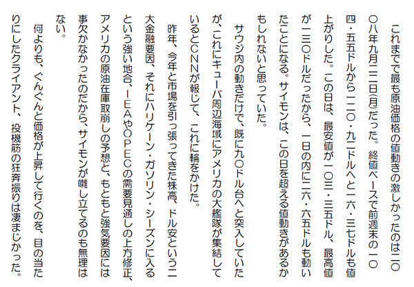 この作品はフィクションであり実在の人物団体等とは一切関係ありません。Copyright(C) 2008-2010 Kazuo KAWAHARA All rights reserved. これまでで最も原油価格の値動きの激しかったのは2008年9月22日(月)だった。終値ベースで前週末の104.55ドルから120.92ドルへと16.37ドルも値上がりした。この日は、最安値が103.35ドル、最高値が130ドルだったから、一日の内に26.65ドルも動いたことになる。サイモンは、この日を超える値動きがあるかもしれないと思っていた。 サウジ内の動きだけで、既に90ドル台へと突入していたが、これにキューバ周辺海域にアメリカの大艦隊が集結しているとCNNが報じて、これに輪をかけた。 昨年、今年と市場を引っ張ってきた株高、ドル安という二大金融要因、それにハリケーン・ガソリン・シーズンに入るという強い地合、IEAやOPECの需要見通しの上方修正、アメリカの原油在庫取崩しの予想と、もともと強気要因には事欠かなかったのだから、サイモンが囃し立てるのも無理はない。 何よりも、ぐんぐんと価格が上昇して行くのを、目の当たりにしたクライアント、投機筋の狂奔振りは凄まじかった。サイモンは嬉しい悲鳴をあげていた。ちょっと前まで資金不足で困っていたのが嘘のようだ。 「イブラヒム、どうだ。何か新しい情報はあるか」 電話の向こうでサイモンは上機嫌だった。「いや、何もない。さっきはホテル・ファイサリアの裏側で凄まじい銃声が暫く続いて、その後、爆発音が一つした。しかし、今は何事も無かったかのように静かになっている。街中にパトカーのサイレンの音が鳴り響いているだけだ」 ファイサリア・レジデンスの警備兵の緊張感は高まっていたが、他の兵士達が集まって来ている風でもない。「そうか。しかし、世界の不安は高まっているぞ。極秘情報を知っているものはほんの僅かだから、キューバ周辺海域に大艦隊が集結しているなどという情報が流されるともうパニック状態だ。オサマ前大統領が未だに解放されていない証左だ。サウジでアハマドが沙漠のサソリに引き渡されない以上、事態に進展は無い筈だ。何が起こったか分からないが、サウジのことだ。スレイマン、アハマドを拘束するかも知れん。そうなれば、オサマが解放されることは無いだろう。世界の不安はより一層高まるばかりだ。まあ、原油は買いだな。このまま100ドルを超えることは間違いがない。ことによったら120ドルくらいまで行くかも知れんぞ。最大の値動きを記録することになるぞ」 サイモンは一気に喋った。「そうか、しまったな。さっき、90ドルを越えたところで一バレル当り20ドルの儲けが出たので、殿下の原油を売ってしまった。俺のものも、それほどではなかったけど、売ってしまった。また、少し買い戻しておこうかな」「馬鹿だな。何でそんなことしたんだ。一刻も早く買い戻した方が良いぞ。俺はお前に前に言った通り、こうなる前に損切りしてしまっていたから、大急ぎで買い戻した。今は買い一色だ。お前は儲けそこなったな」 サイモンは、早口で喋ると直ぐに電話を切った。急いで更に買い増しをするつもりだったからだ。 やがて、原油価格はサイモンの言っていた通り100ドルを超えた。イブラヒムは地団太を踏んでいた。人気ブログランキングに参加しています。クリックのほどよろしく