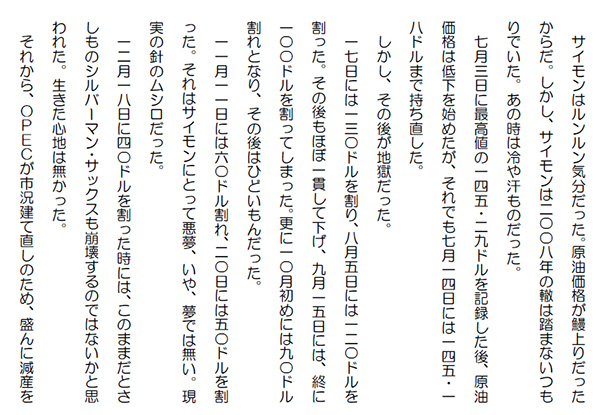 この作品はフィクションであり実在の人物団体等とは一切関係ありません。Copyright(C) 2008-2010 Kazuo KAWAHARA All rights reserved. サイモンはルンルン気分だった。原油価格が鰻上りだったからだ。しかし、サイモンは2008年の轍は踏まないつもりでいた。あの時は冷や汗ものだった。 7月3日に最高値の145.29ドルを記録した後、原油価格は低下を始めたが、それでも7月14日には145.18ドルまで持ち直した。 しかし、その後が地獄だった。 17日には130ドルを割り、8月5日には120ドルを割った。その後もほぼ一貫して下げ、9月15日には、終に100ドルを割ってしまった。更に10月初めには90ドル割れとなり、その後はひどいもんだった。 11月11日には60ドル割れ、20日には50ドルを割った。それはサイモンにとって悪夢、いや、夢では無い。現実の針のムシロだった。 12月18日に40ドルを割った時には、このままだとさしものシルバーマン・サックスも崩壊するのではないかと思われた。生きた心地は無かった。 それから、OPECが市況建て直しのため、盛んに減産を繰り返した他には、これと言って、需給面での強気要因は皆無に近かった。 それを救ったのが、株高、ドル安の二大金融要因だった。OPECがいくら減産をしても原油は余剰で、世界的に石油在庫が膨らんではいたが、主としてアメリカ、ヨーロッパ各国政府の懸命な金融立て直し策が徐々に効いて、株価が回復をし始めたからだ。 リーマンなど主要投資銀行が破綻する中、シルバーマン・サックスは、ぎりぎりでその危機を凌いだ。大投資銀行の破綻、総崩れとなれば、アメリカだけではなく、世界経済が破綻してしまうから、アメリカ政府も懸命に税金を投入して救済に乗り出したからだ。 ダウ平均は2009年3月中旬には6600ドルを割り込んでいたが、6月中旬には8800ドル近くまで回復した。この間、原油価格は40ドル台から70ドル台へと回復した。 多くの同僚がシルバーマンから解雇され、去って行ったが、生き残ったサイモン達は必死で失地回復に挑んだ。その甲斐あって、大損を何とか最小限の損失に止めることが出来たが、それも、需給には何等変化が無いという厳しい背景の中で、株高を背景に原油価格が回復してくれたことが支えだった。 勿論、イブラヒム、アブドルアジズが協力してくれたことも強い支えになった。そんなことだったから、イブラヒムの正当だが身に沁みた皮肉も甘んじて受け入れた。 それがどうだ。今年は余裕だった。2008年の暴騰時という分けには行かないが、かなりのボーナスも戻った。それもこれも翻って考えれば、国民の税金投入のお蔭だと思っていた。サイモンはこの時ばかりは、アメリカ政府に深く食い込んでいたシルバーマンに居て良かったとつくづく思ったものだ。 嫌な思い出だ。サイモンは、原油先物の自動購入ボタンを押して自宅に戻ることにした。今晩は、嫌なことを思い出したりはしたが、一日当りの儲けでは、これまでにも無い利幅を得ることが出来るだろうと確信していた。 ニンマリとしながら、オフィスの扉を占め、愛車ベンツSLRスターリング・モスの待つ駐車場へと向かった。 人気ブログランキングに参加しています。クリックのほどよろしく