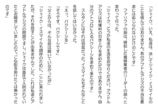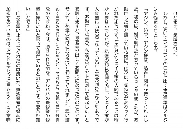 この作品はフィクションであり実在の人物団体等とは一切関係ありません。Copyright(C) 2008-2010 Kazuo KAWAHARA All rights reserved. 「シェイク。いえ、私達は、決してシェイク・イスマイルのことを恨んではおりません。あのアブドルアジズの不当な要求には応じられないだけのことです」ファリファの顔は、蜂起した養蜂業者のリーダーの顔へと変わって行った。「シェイク。どうか私達の生活をお守りください。アブドルアジズは利権料の引き上げを求めただけではありません。自分のフトコロに入るバクシーシを求めて来たのです」 スルタンにはそれは初耳だった。イスマイルもそんなことを話してはいなかった。「えっ、バクシーシを」「そうです。バクシーシです」「父上からは、そんな話は聞いていなかったが」「シェイク・イスマイルも調停のために、ここに来られましたが、それを話すことが出来ませんでした。これは私達とアブドルアジズの問題ですし、シェイクは血圧で入院されていたとお聞きしていましたので、ご心配を掛けたくは無かったのです」 スルタンは、確かに、イスマイルがそれを聞いたら相当に悩んでいただろうと思っていた。アブドルアジズに腹を立てても、それをアブドルアジズにぶつけることなど出来ない。板ばさみになるだけだ。「有難う。ファリファ」「それでも、どうしてでしょう。シェイク・スルタンには、助けて下さいと実情を訴えることが出来ましたのは」 ファリファは、自然にそれを口に出していた。アルミナを亡くした、自分の苦境を救ってくれた、スルタンはきっと自分達のために何かしてくれると心の底で確信していたのだろうか。「不思議です。本当に」 ファリファは頬を紅潮させていた。また、ふっと、普通の女性の顔に戻っていた。「ファリファ。皆さんの声をきっとアブドルアジズに伝えましょう。彼には有り余るほどの収入がある。何故、そんなことまでしなければならなかったのか、私には分からない。私は養蜂業の窮状を十分に承知している。アブドルアジズにはそれを正確に伝えよう」 スルタンは、アブドルアジズがアルバハの養蜂業を潰しに掛かっているとしか思えなかった。シバの女王の時代から連面と続く歴史と伝統を持つ、この町の主たる産業を一旦灰燼に帰して、そこから自分の好みの新たな産業を興そうと考えているのか、皆目見当も付かなかった。あるいは単なる引け目を核にした腹いせにしか過ぎないのか。「シェイク。有難うございます。ぜひ、お願い致します」 スルタンはいつの間にか、蜂起した養蜂業者の一員になったような気分でいた。 「ところで、ファリファ。あの断崖付近でヤシンというシェイク家の人間を見掛けなかったかい」 スルタンは、いよいよ本題へと入った。「あの方はシェイク家の方だったのですか。蜂起している仲間の一人が昨日自殺未遂者を保護したと連絡して来ていました。確か、その人の名前がヤシンでした」 それを聞いて、スルタンは、ホッと一息ついた。人気ブログランキングに参加しています。クリックのほどよろしく