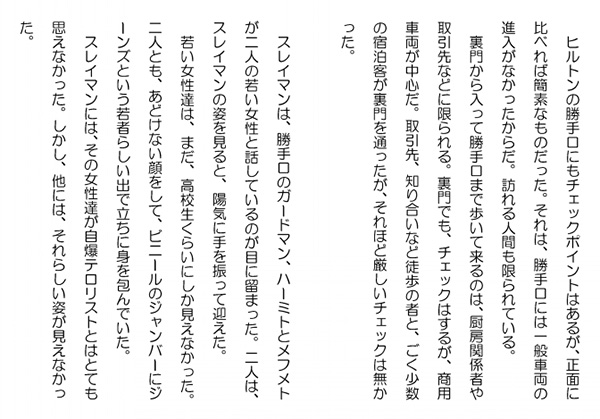 この作品はフィクションであり実在の人物団体等とは一切関係ありません。Copyright(C) 2008-2010 Kazuo KAWAHARA All rights reserved. ヒルトンの勝手口にもチェックポイントはあるが、正面に比べれば簡素なものだった。それは、勝手口には一般車両の進入がなかったからだ。訪れる人間も限られている。 裏門から入って勝手口まで歩いて来るのは、厨房関係者や取引先などに限られる。裏門でも、チェックはするが、商用車両が中心だ。取引先、知り合いなど徒歩の者と、ごく少数の宿泊客が裏門を通ったが、それほど厳しいチェックは無かった。 スレイマンは、勝手口のガードマン、ハーミトとメフメトが二人の若い女性と話しているのが目に留まった。二人は、スレイマンの姿を見ると、陽気に手を振って迎えた。 若い女性達は、まだ、高校生くらいにしか見えなかった。二人とも、あどけない顔をして、ビニールのジャンバーにジーンズという若者らしい出で立ちに身を包んでいた。 スレイマンには、その女性達が自爆テロリストとはとても思えなかった。しかし、他には、それらしい姿が見えなかった。ハーミトが"スレイマン様"と呼びかけると、その若い女性達が満面の笑みでスレイマンを見た。まさか、と思ったが、そのあどけない顔をした女性の一人が声を掛けてきた。「スレイマン様ですね。ヤセミーンでございます」「おう、ヤセミーンか、良く来たな」 スレイマンはヤセミーンと握手をした。手の感触はどこまでもふわふわと柔らかい。「イゼルです」 続いて、隣の女性もスレイマンに手を差し出した。「おう、君がイゼルか。噂には聞いていたよ。よろしくね」同じように柔らかな感触だった。 ヤセミーン、イゼルと言うのは、ムスタファの伝えて来ていたとおりの名前だった。イゼルの手を握ったまま、もう一度、スレイマンは、ヤセミーン、イゼルの姿を見た。にこやかな笑顔が印象的だ。スレイマンが手懐けていなくとも、ガードマンは彼女達が自爆テロリストなどとはとても思い付かないことだろうと思えたくらい、テロと言う言葉からはほど遠い姿だった。「ハーミト、メフメト、ご苦労様」 スレイマンは、今度は、ハーミト、メフメトと軽く握手をした。いつの間にか、スレイマンは小さくたたんだ紙幣を手に持ち、握手の時に、二人に渡していた。「スレイマン様。いつも済みません」 二人は、それをそのままさっとポケットにしまった。 「ヤセミーン、イゼル。それでは、まず、美味しい料理でもご馳走しよう」 スレイマンは、二人を従えて歩き出した。「スレイマン様、いつもお気遣い頂き、済みません。有難うございます」「わ~。ヒルトンでお食事なんて。嬉しいな」 イゼルは陽気だった。 スレイマンには、もう直、こんな若者が自爆するとはとても思えなかった。そして、スレイマンは、ヤセミーン、イゼルが疑われないために、わざと陽気に振舞っているのかもしれないと思ったりしていた。 人気ブログランキングに参加しています。クリックのほどよろしく