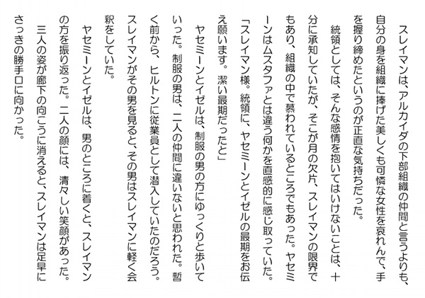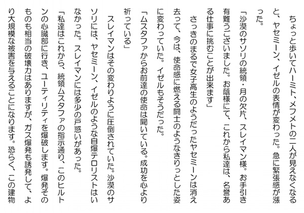 この作品はフィクションであり実在の人物団体等とは一切関係ありません。Copyright(C) 2008-2010 Kazuo KAWAHARA All rights reserved. ちょっと歩いてハーミト、メフメトの二人が見えなくなると、ヤセミーン、イゼルの表情が変わった。急に緊張感が漲った。「沙漠のサソリの統領・月の欠片、スレイマン様。お手引き有難うございました。お蔭様にて、これから私達は、名誉ある仕事に挑むことが出来ます」 さっきのまるで女子高生のようだったヤセミーンは消え去って、今は、使命感に燃える闘士のようなきりっとした姿に変わっていた。イゼルもそうだった。「ムスタファからお前達の使命は聞いている。成功を心より祈っている」 スレイマンはその変わりように圧倒されていた。沙漠のサソリには、ヤセミーン、イゼルのような自爆テロリストはいなかった。スレイマンには多少の戸惑いがあった。「私達はこれから、統領ムスタファの指示通り、このヒルトンの心臓部に行き、ユーティリティを爆破します。爆発そのものも相当の破壊力はありますが、ガス爆発も誘発して、より大規模な被害を与えることになります。恐らく、この建物は倒壊するものと思われます。スレイマン様にも、出来るだけ早く、ここから退去して頂きたいと思います」 ヤセミーンはきっぱりと言った。「有難う。既に私は退去の準備は出来ている。お前達が成功するよう最後まで協力しよう」 スレイマンは、ユーティリティまで着いて行って、邪魔者が入れば排除してやろうと思っていた。「お気持ち有難うございます。しかし、これまでのご協力だけで十分でございます。もう直ぐここに私達の仲間が参ります。ご心配はご無用でございます」「そうか、そうであろうな。ムスタファは用意周到だと思う。余計なことを言ってしまった。それでは、私はその者達がやって来たところで、退去しよう」 スレイマンは、ヤセミーンの目を覗き込んだ。ヤセミーンは、覚悟をした、全てが吹っ切れたような顔をしていた。スレイマンはそこに清々しささえ感じていた。ヤセミーンにはスレイマンの優しさが素直に伝わったようだった。「スレイマン様。私達は、もう直ぐ天国に参ります。こんな幸せなことはありません。私の身寄りは既に誰もおりません。皆、イスラエルの犠牲になってしまいました。思い残すことはありません。イゼルは、家族のために身を捧げるつもりでおります」 スレイマンは、イゼルの顔をみた。イゼルは頷いていた。「イゼルは私と違い、このトルコの貧しい家庭の長女として生まれました。統領は、イゼルが身を捧げる代わりに、彼女の家族の面倒を見てくれることになっています。有り難いことです。そして、何よりも、彼女も私も神に召されて天国に行くのですから」 ヤセミーンは、これから死地に出向くために、自分達の心を整理するように、スレイマンにそう語った。自分達に覚悟を言い聞かせている風でもあった。スレイマンは黙ってそれを聞いていた。 すると、廊下に靴音が響いて、廊下の突き当たりにヒルトンの制服を着た男が現れた。「スレイマン様。本当に有難うございました」 ヤスミーンはスレイマンの手を握り締めた。人気ブログランキングに参加しています。クリックのほどよろしく