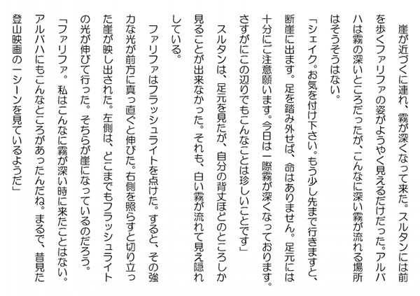 この作品はフィクションであり実在の人物団体等とは一切関係ありません。Copyright(C) 2008-2010 Kazuo KAWAHARA All rights reserved. 崖が近づくに連れ、霧が深くなって来た。スルタンには前を歩くファリファの姿がようやく見えるだけだった。アルバハは霧の深いところだったが、こんなに深い霧が流れる場所はそうそうはない。「シェイク。お気を付け下さい。もう少し先まで行きますと、断崖に出ます。足を踏み外せば、命はありません。足元には十分にご注意願います。今日は一際霧が深くなっております。さすがにこの辺りでもこんなことは珍しいことです」 スルタンは、足元を見たが、自分の背丈ほどのところしか見ることが出来なかった。それも、白い霧が流れて見え隠れしている。 ファリファはフラッシュライトを点けた。すると、その強力な光が前方に真っ直ぐと伸びた。右側を照らすと切り立った崖が映し出された。左側は、どこまでもフラッシュライトの光が伸びて行った。そちらが崖になっているのだろう。「ファリファ。私はこんなに霧が深い時に来たことはない。アルバハにもこんなところがあったんだね。まるで、昔見た登山映画の一シーンを見ているようだ」 前にスルタンが来た時には、うっすらと霧が流れ、その先にこれから行く、お城が見えたものだ。断崖の下も相当遠くまで見下ろせた。「この辺りの天候は急変します。季節は、勿論、その日の内の変化も大きいのです。お城に向かう時には、雪、霙、氷など様々な変化に対応出来るよう装備を整えて参ります」 スルタンは、こんなところに雪が積もったり、氷が張ったりしたら、とても先には進めないだろうと思っていた。難攻不落の城という意味が更に良く判った。「そうだろうね。それはファリファのように、この辺りを良く分かっている人の実感なんだろうね。私のように、天気の良い時しか知らない人間は、こんなことを知らずに足元を掬われてしまうのだろうね。そして、ここに来て驚いてしまう。分かれば、あのナポレオンでも、冬には、とてもこの城を攻める気にはならないことだろう」 二人は一歩一歩足元を確かめながら、城へと歩いて行った。 道は段々と狭く、急勾配になって行った。スルタンは特に左側の崖には気を付けて歩いていた。 大きな石を踏み外すと、その石が、大きな音を立てて、崖を転げ落ちて行く。音が小さくなって行くと、それが谷でこだまする。「ファリファの言ったように、ここから落ちたらひとたまりもないね。霧の日は特に危険が一杯だ。しかし、霧が深くなかったら目が眩むところだったかもしれないし、どちらにしても救われないか」 スルタンは冗談ぽく言ったが、その険しさは十分に自覚していた。 イスタンブールの"月の欠片"スレイマンは、ヒルトンの勝手口へと向かっていた。時の過ぎるのは早いものだ。ムスタファのヒルトン爆破計画は、既に実行に移された。 どんな奴が自爆テロを実行するのだろうか、と全く面識の無い実行犯のことを頭の中に思い描いていた。それももう直ぐはっきりとする。今頃は、この間から、手懐けておいた、ガードマンと話を始めている頃だろう。勝手口に通じる廊下は薄暗い。スレイマンの靴音がそこにこだましていた。人気ブログランキングに参加しています。クリックのほどよろしく