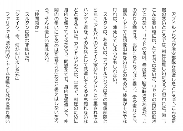 この作品はフィクションであり実在の人物団体等とは一切関係ありません。Copyright(C) 2008-2010 Kazuo KAWAHARA All rights reserved. アブドルアジズが治安部隊を派遣したところで、こんな足場の悪いところでは、制圧は難しいだろうと思われた。第一、こんな寒い時には、とてもではないが、リヤドの兵隊は動きがとれない。リヤドの冬は、零度を下回る時さえあるが、この辺りの寒さは、比較にならないほど寒い。雪や霙なども、到底リヤドでは想像出来ないほどのものだ。装備が十分でなければ、凍死してしまうかもしれない。 スルタンは、あるいは、アブドルアジズはその精鋭部隊とともに、アルバハのシェイク家からリヤドへと召集されたムハンマド達を、その先兵として派遣してくるかも知れないなどと考えていた。アブドルアジズは、平気で、制圧のために身内を使ってくるだろう。間違えても、身内を派遣して、仲間内の争いにするのは可哀そうだなどと考えはしないだろう。そんな優しい筈はない。「仲間内か」 スルタンは思わず呟いた。「シェイク。今、何か仰いましたか」 ファリファは、城の門のチャイムを鳴らしながら振り向いた。「いや、何でもない。独り言だ」 中から守衛の声が聞えた。「こんな時間に誰だ」「ファリファです」「ファリファ様、これはどうも。直ぐに開けますので、お待ちください」 守衛はファリファと聞いて、慌てて門を開けた。 門の向こうには、城の玄関に通じる道が続いていた。崖の上は、それほどのスペースがあるわけではないので、それほど長い道ではない。道の両側には、整然と木々が植えられている。「ファリファ様、城の者には、いらっしゃったことを、直ぐにお伝えしておきます。玄関に着かれるまでには、扉が開きます」「有難う」「それでは、失礼します」 守衛は、そう言うと、直ぐにインターフォンを取り上げて、喋り始めた。「シェイク。それでは、参りましょう」 ファリファは、スルタンと一緒に玄関の扉に向かって歩き始めた。 玄関が近づくと、重々しい音を立てて扉が開いて、中から中老の男が顔を出した。「ファリファ様、ようこそ。こんな足元の覚束ない時にいかがされましたか」「カイス。シェイク・スルタンがお見えになって、ヤシン様にお会いしたいと言うことです」「えっ、今、何と仰いました。ヤシン様と。あのヤシンが」 カイスは、戸惑っていた。自分の助けたあの若者がリーダーのファリファ様が様を付けて呼ばなければならない方だと言うのか。一体、彼は何者なのだ。「ヤシン様は、シェイク・スルタンの弟君だったのです。私もお聞きして驚いているところです」 は、驚いて声も出なかった。人気ブログランキングに参加しています。クリックのほどよろしく