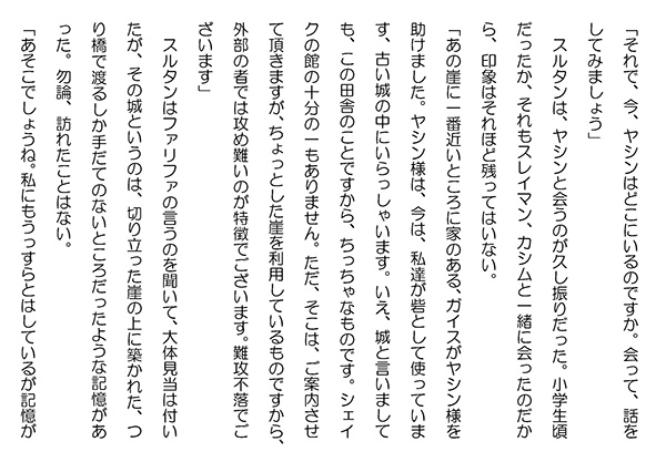 この作品はフィクションであり実在の人物団体等とは一切関係ありません。Copyright(C) 2008-2010 Kazuo KAWAHARA All rights reserved. 「それで、今、ヤシンはどこにいるのですか。会って、話をしてみましょう」 スルタンは、ヤシンと会うのが久し振りだった。小学生頃だったか、それもスレイマン、カシムと一緒に会ったのだから、印象はそれほど残ってはいない。「あの崖に一番近いところに家のある、ガイスがヤシン様を助けました。ヤシン様は、今は、私達が砦として使っています、古い城の中にいらっしゃいます。いえ、城と言いましても、この田舎のことですから、ちっちゃなものです。シェイクの館の十分の一もありません。ただ、そこは、ご案内させて頂きますが、ちょっとした崖を利用しているものですから、外部の者では攻め難いのが特徴でございます。難攻不落でございます」 スルタンはファリファの言うのを聞いて、大体見当は付いたが、その城というのは、切り立った崖の上に築かれた、つり橋で渡るしか手だてのないところだったような記憶があった。勿論、訪れたことはない。「あそこでしょうね。私にもうっすらとはしているが記憶がある。霧のかなたにぼんやりと見えていた。切り立った崖の上と言ったが、周りも険しい崖に囲まれていて、あそこには、ヘリでも飛行機でも近づけないのではないかと思われる。確かに、難攻不落かもしれない。近代兵器を持ってしても攻め難いことだろう。大部隊の大戦などはとても出来そうもない」 スルタンは、まるでSF映画にでも出てきそうな、その佇まいを思い出していた。「仰せの通りでございます。それに、良く霧が出ますし、これからは、冷たい強い風、それに雪、霙などが吹き付けたりしますから、とても、攻撃することなど、いえ、無事、たどり着くことさえ難しいところでございます」 ファリファは、スルタンをその場に待たせると、身支度を整えに奥の部屋へと入って行った。 きっと奥には、あの年老いた母と、ヨーロッパ留学から戻っている娘がいるに違いないと思っていた。 ファリファは、直ぐに戻って来た。 城の周りには既に、深い霧でも出ているのだろうか。手には、レスキュー部隊が持っていそうなフラッシュライトを持っていた。「シェイク。今日は、特に霧が深いですから、お気を付けください。でも、風がそれほど強くないですから、救われます。それでは、宜しければ参りましょう」 ファリファが、玄関の扉を開けると、冷たい霧が中に流れ込んで来た。リヤドから戻ったばかりのスルタンには、身に沁みた。ぶるぶるっと体を震わせると、ファリファの後に付いて歩き出した。 ファリファは、そんなスルタンを見て微笑んでいる。スルタンは、その笑顔を見て、まるで天使のような、清らかで美しい笑顔だと思っていた。 歩き始めると、徐々に寒さに体が慣れてきた。スルタンはもともと身長一八二センチ、体重八五キロのがっちりとした体格だったし、アルバハの寒い気候の中で育って来た分けだから、この辺りは、シェイク家のあるところよりは寒いとは言え、心地良い寒さと感じるようになって来た。人気ブログランキングに参加しています。クリックのほどよろしく