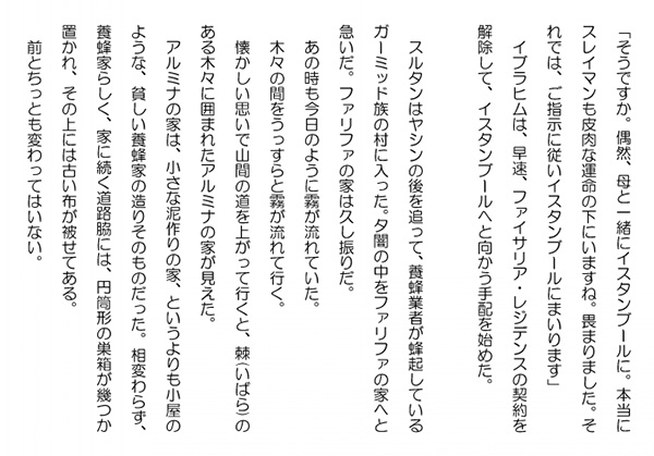 この作品はフィクションであり実在の人物団体等とは一切関係ありません。Copyright(C) 2008-2010 Kazuo KAWAHARA All rights reserved. 「そうですか。偶然、母と一緒にイスタンブールに。本当にスレイマンも皮肉な運命の下にいますね。畏まりました。それでは、ご指示に従いイスタンブールにまいります」 イブラヒムは、早速、ファイサリア・レジデンスの契約を解除して、イスタンブールへと向かう手配を始めた。 スルタンはヤシンの後を追って、養蜂業者が蜂起しているガーミッド族の村に入った。夕闇の中をファリファの家へと急いだ。ファリファの家は久し振りだ。 あの時も今日のように霧が流れていた。木々の間をうっすらと霧が流れて行く。懐かしい思いで山間の道を上がって行くと、棘(いばら)のある木々に囲まれたアルミナの家が見えた。アルミナの家は、小さな泥作りの家、というよりも小屋のような、貧しい養蜂家の造りそのものだった。相変わらず、養蜂家らしく、家に続く道路脇には、円筒形の巣箱が幾つか置かれ、その上には古い布が被せてある。前とちっとも変わってはいない。スルタンは、また、あの時のように、美しいファリファが出て来るのだろうかと想いながら、胸を弾ませながら、玄関の扉を叩いた。扉を開けて出て来たのは、やはり、ファリファだった。服装は前と同じで、安物の刺繍の付いた黒いミズナドという服を纏い、その上に小さな皮を縫い合わせて作ったミッザルを羽織っていた。しかし、そんなみすぼらしい衣服を纏っているのに、まるで天使のように神々しい。前の通りだ。全く変わっていない。スルタンを見据えるファリファの円らな瞳はキラキラと輝いていた。「シェイク・スルタンさま、シェイク・スルタンさまではありませんか」 ファリファはスルタンの突然の訪問に、その美しく輝く目を見開いて驚いていた。相変わらず清楚で美しい。と、スルタンは、眩しそうにファリファの瞳を見詰めていた。「アッサラーム・アレイコム。ファリファ」 ファリファは、スルタンの挨拶を聞いて、思いも寄らないスルタンの訪問に驚いて挨拶をするのも忘れていたことを思い出した。「アレイコム・サラーム。スルタンさま。申し訳ございません。私の方から先にご挨拶しなければいけなかったのですが。あまりに驚いたものですから。大変、失礼致しました」 ファリファは、取り乱して頬を赤らめていた。スルタンはそれを可愛らしいと思った。とても、蜂起した養蜂業者のリーダーとは思えなかった。「いやいや、良いのだ。気にすることはない。ファリファが変わりないようで良かった。お母様、娘さんも変わりはないか」 スルタンは、相変わらず美しいと素直に言いたかったが、アラブ社会ではそれは禁句だ。ファリファが、頷くのを見ると、早速、用件に入った。「ファリファ。この度は、シェイク・イスマイルがアブドルアジズに養蜂業の利権を渡したばかりに迷惑を掛けたな」 ファリファの笑顔が消えた。人気ブログランキングに参加しています。クリックのほどよろしく