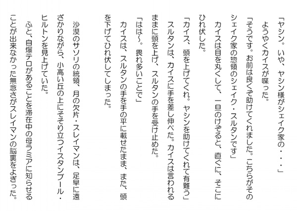 この作品はフィクションであり実在の人物団体等とは一切関係ありません。Copyright(C) 2008-2010 Kazuo KAWAHARA All rights reserved. 「ヤシン。いや、ヤシン様がシェイク家の・・・」 ようやくカイスが喋った。「そうです。お前は良くぞ助けてくれました。こちらがそのシェイク家の惣領のシェイク・スルタンです」 カイスは目を丸くして、一旦のけぞると、直ぐに、そこにひれ伏した。「カイス、頭を上げてくれ。ヤシンを助けてくれて有難う」 スルタンは、カイスに手を差し伸べた。カイスは言われるままに頭を上げ、スルタンの手を受け止めた。「はは~。畏れ多いことで」 カイスは、スルタンの手を手の平に載せたまま、また、頭を下げてひれ伏してしまった。 沙漠のサソリの統領、月の欠片・スレイマンは、足早に遠ざかりながら、小高い丘の上にそそり立つイスタンブール・ヒルトンを見上げていた。 ふと、自爆テロがあることを滞在中の母ラミアに知らせることが出来なかった無念さがスレイマンの脳裏をよぎった。スレイマンは強く頭を振って、その考えを消し去ろうと試みた。自分は、大義を貫くために血縁を断ったのではないか、そう言い聞かせていた。しかし、そう簡単に割り切れるものでは無い。スレイマンは運命の皮肉を恨むしか無かった。スレイマンは、もう一度、頭を振ると、この白亜の巨大な建物が爆発とともに崩れ去る光景を頭に描くよう努めていた。ようやく、その光景が描かれると、そこにヤセミーンとイゼルの清々しい笑顔が重なった。途端に、大音響が起き、イスタンブール・ヒルトンが大きく揺れた。崩れ去ることは無かったが、数度の爆発で、建物の一部が崩壊し、火の手が上がった。見る見るうちに、建物の半分ほどが黒い煙と赤い炎に包まれた。建物のあちらこちらから悲鳴が上がった。逃げ惑う声、客を誘導する声、怒声、周囲は一挙に騒がしくなった。遠くの方からは、救急車とパトカーが駆けつける音が聞こえてきた。そして、それがどんどんと近くなって来る。様々な方向から、それがこだまのように波を打って押し寄せて来た。静寂だったヒルトンは、今は、まるで阿鼻叫喚の地獄絵のようだった。 ヤシンは、断崖の上の城の中で、テレビを見ていた。ついさっき始まったCNNのトップニュースは、イスタンブールの自爆テロだった。 自爆テロの対象が母ラミアの滞在しているイスタンブール・ヒルトンであることが判ると身を乗り出した。半壊状態で火を噴いている光景からすると、相当数の死者が出たと思われた。ヤシンは、その中に母ラミアそれに召使のナディアが入っていないことを祈っていた。 そこに、ファリファ、カイスに伴われて、スルタンが入って来た。ヤシンは、スルタンがやがて現われるに違いないと思っていたので、スルタンへの対応を入念に考えてはいたが、テレビ画面のイスタンブールの光景に完全に気が奪われていた。「シェイク、大変です。母の滞在しているイスタンブール・ヒルトンが自爆テロで炎上しています」人気ブログランキングに参加しています。クリックのほどよろしく