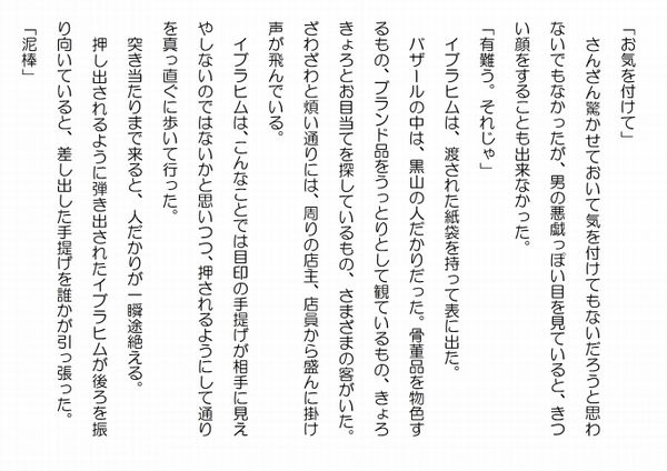 この作品はフィクションであり実在の人物団体等とは一切関係ありません。Copyright(C) 2008-2010 Kazuo KAWAHARA All rights reserved. 「お気を付けて」 さんざん驚かせておいて気を付けてもないだろうと思わないでもなかったが、男の悪戯っぽい目を見ていると、きつい顔をすることも出来なかった。「有難う。それじゃ」 イブラヒムは、渡された紙袋を持って表に出た。 バザールの中は、黒山の人だかりだった。骨董品を物色するもの、ブランド品をうっとりとして観ているもの、きょろきょろとお目当てを探しているもの、さまざまの客がいた。ざわざわと煩い通りには、周りの店主、店員から盛んに掛け声が飛んでいる。 イブラヒムは、こんなことでは目印の手提げが相手に見えやしないのではないかと思いつつ、押されるようにして通りを真っ直ぐに歩いて行った。 突き当たりまで来ると、人だかりが一瞬途絶える。 押し出されるように弾き出されたイブラヒムが後ろを振り向いていると、差し出した手提げを誰かが引っ張った。「泥棒」 イブラヒムは思わず叫んだ。「しっ、人聞きの悪い。ムスタファの使いのものです」 二メートル近い身長のある大男が、紙袋から手を離した。「おお、出迎え、有難う」 大男の目も悪戯っぽく笑っている。あの店主らしい男と同じような目だった。イブラヒムは、足早に歩く大男の後に続いた。 大男は、周りをさっと見渡すと、さっと細い路地に消えた。イブラヒムは紙袋を脇に抱えてその後を追う。二人の姿は一瞬にして通りから消えた。 ラミア達はイスタンブールからベイルートに着いた。ヤシンはベイルートが初めてだった。初めてなのに、地中海に面したその街が懐かしい街のように思えた。 兄のカラムから聞かされていた通りの情景が続く。カラムの撮って来た写真を見ながら聞いている内にベイルートに行ったような錯覚に陥ったものだ。 聞いていた通りの明るく開放的な街だ。ヤシンはそう実感した。一時は内戦などで壊滅的な打撃を受けたが、大分立ち直っていた。未だに、テロの脅威が無い分けではないが、どこまでも青い空、青い海が優しく人々の心を和ませてくれる。 ヤシンはうっとりとして目の前の光景を眺めていた。 「ヤシン、お前はベイルートが初めてだったね」「ええ、そうです」 ラミアはヤシンを見ただけで、ヤシンが一目見てベイルートを気に入ったことが判った。「今の時期は、このベイルートでスキーを楽しむことも出来るのよ」 ヤシンは目を丸くした。「四月頃までは滑ることが出来て、その頃は、海岸線では水泳も出来るから、レバノンの人達は、一日の内に海水浴とスキーが楽しめるなんて自慢しているわ」 ヤシンの目はますます丸くなっていた。「ここから車で一時間も掛からないファラヤ・スキー場からは山越しに真っ青な地中海を見ることが出来るのよ」人気ブログランキングに参加しています。クリックのほどよろしく