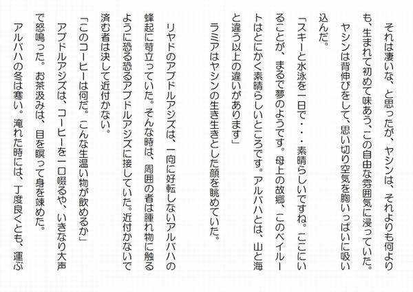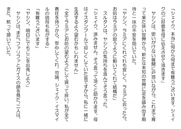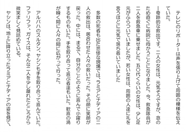この作品はフィクションであり実在の人物団体等とは一切関係ありません。Copyright(C) 2008-2010 Kazuo KAWAHARA All rights reserved. テレビのリポーターは声を張り上げて周囲の模様を伝えていた。-奇跡的な救出です。二人の女性は、元気そうですが、念のため直ぐに病院に向かうことになりました。今、救急隊員が二人を救急車に乗せました。五〇代くらいの女性は、少し足元がふらついていましたが、若い女性は、周囲の人達に礼を言うほどに元気で落ち着いていました 多数の死者も出た悲惨な現場では、ラミアとナディアの二人の救出は、居合わせた人々の救いだった。その顔に笑顔が戻った。中には、まるで、自分のことのように喜んで小躍りするものもいた。手を取り合って喜ぶ者達もいた。歓喜の渦が瞬く間に人々の間に広がって行った。 アルバハのスルタン、ヤシンも手を取り合って喜んでいた。ファリファ、ガイスは、そんな二人を少し離れたところから微笑ましく見詰めている。 ヤシンは、地上に降り立ったラミアとナディアの姿を見て、思わず涙を流していた。「シェイク。これもアラーのお導きです」 ヤシンはスルタンの左手を両手で握り締めた。 スルタンは、ヤシンの手を右手でポンポンと軽く叩いた。「良かった。ヤシン、お前は、早速、ラミアのところに駆け付けてあげれば良い。ラミアもきっと喜ぶに違いない」 ヤシンの顔は輝いた。「えっ、シェイク、宜しいのですか」 思いも掛けなかったスルタンの言葉に、ヤシンは戸惑いつつも嬉しさが込み上げて来た。スルタンはそれを直ぐに察した。「シェイク・イスマイルのことなら、心配無い。私が説得する。いや、シェイクもきっと、"ヤシンよ、ラミアのところに行ってくれ"と、そう言うに違いない」 ヤシンはファリファとガイスの顔を見た。ファリファとガイスは頷いていた。「私は、アブドルアジズの理不尽な要求を聞いて、ここに立て篭もってファリファやガイス達と一緒に戦うつもりでした。それがシェイク家として彼等のために何も出来なかった償いになると思ったのです」 スルタンもシェイク家が何も出来なかったことを口惜しく思っていた。しかし、そんなことを口にするわけには行かない。「ヤシン様。有難うございます。お気持ち、有難く頂戴しておきます。今は、お母上のところにお急ぎ下さい。さぞや喜ばれることでございましょう」 蜂起を主導したファリファは、ヤシンが加わってくれたことを頼もしく思っていたから、ここに止まってくれと言いたかった。しかし、ラミアの救出を見た後は、とても、ヤシンに止まってくれなどと依頼することは出来なかった。「シェイク。それでは、申し訳ありませんが、私をイスタンブールに行かせてください」「ヤシン。行ってくれるか。くれぐれも宜しく頼むぞ。お前も知っての通り、私はサウド外相と非常に近い。パスポートの用意などはお手の物だ。在トルコ・サウジ大使館にお前を手助けするよう依頼しておこう。渡航費用も私が用意する」人気ブログランキングに参加しています。クリックのほどよろしく