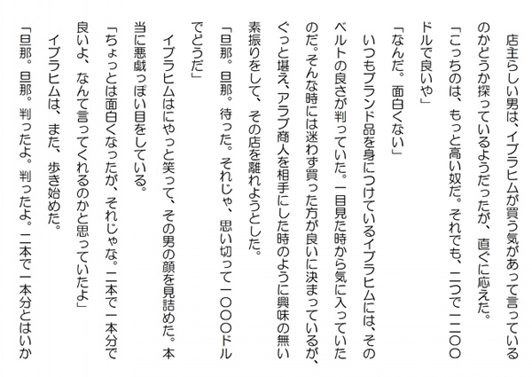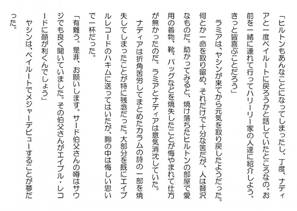 この作品はフィクションであり実在の人物団体等とは一切関係ありません。Copyright(C) 2008-2010 Kazuo KAWAHARA All rights reserved. -ふん、何でも良い。とにかく儲かりゃ良い。この世界ではそれが全てだ。植木さんのような専門家はいらない。却って踏ん切りを悪くさせるだけだ。不当、不公正などと言われると、心の内にぐさりと来るが、そう感じるのは俺くらいだろう。サイモンなんざ割り切っていた。いや、皆そうだ 敬虔なモスレムになったイブラヒムだから、多少心が痛むのだろう。それに、暫く先物取引から遠ざかっていて、復帰したばかりだったし、気持ちが淡白になっていたから、直ぐにそこで大量に売りに出た。原油価格はまだまだ上がりそうだったから、アブドルアジズに後から怒られるかも知れないなどとも思ったが、もうこれで十分という感覚だった。 ヤシンは、スルタンの取り計らいで、あっと言う間にサウジを出国出来た。イスタンブールでは、母ラミア、召使のナディアと久々に再会出来て、天にも昇るような気持ちだった。息苦しい、窒息しそうな世界から、無事抜け出せたのは幸いだった。この時ばかりは、あの断崖に身を投げないで良かったとつくづく思った。 父シェイク・イスマイルには、迷惑ばかり掛けて、そのまま逃げて来てしまった。心は痛んだが、しかし、ヤシンにしてみれば、自分の崇拝するカシムもそうだったが、サウジにいたのでは、所詮、アーチストとして活躍など出来ないし、その音楽的才能を生かすことなどは出来ない。自分の信念を曲げて、働くことなどは出来ない。それは死んだも同然だと思っていた。イスマイルからすれば遊びほうけた放蕩息子としか思えないのだろうが、そうではない。兄、カラムだってそうだと思っていた。 ヤシンには、毎日が苦しい地獄の責め苦の中で生きていたように思えた。 それが今はどうだ。このイスタンブールの自由な雰囲気の中でこうして母に抱かれていると、全く生まれ変わって希望に満ちた人生を歩める夢が膨らんでいた。「そうかい。ヤシンも、カシムのようにアーチストを目指したいのかい。そうかい。二人の曲を売り出してくれた、エイブルレコードにデビューしたいと申し込んだのかい。そのターハという人は知らないけど、ムハンマドは良く知っている。それじゃ、私から兄サードに頼んで、エイブルレコードにお前の話をしてみよう」 ヤシンには信じられないような展開だった。 ターハが言うには、エイブルレコード側は、けんもほろろだった。まるで取りつく島が無かったとのことだった。 随分、悲しい思いをした。 エイブルレコードは見る目がない、大衆に迎合するようなことしか考えないところなのだろうなどと大見得を切って見たが、それは、半分、自分を慰めるようなものだった。そんなことがあっても、自分の才能を信じてはいたが、次第に自分の才能に自信が持てなくなっていた。 そんなことだったので、ラミアが掛け合ってくれても、どうなるものでもないかもしれないなどと思わないでもなかった。「母上、有難う」 ヤシンは、期待と不安の入り混じった複雑な心境だった。「ヒルトンもあんなことになってしまったし、丁度、ナディアと一度ベイルートに戻ろうかと話していたところだった。お前をハリーリー家の皆に紹介しよう」 ラミアは、ヤシンが来てから元気を取り戻したようだった。何とか一命を取り留め、それだけで十分な筈だが、人は贅沢なものだ。助かってみると、焼け落ちたヒルトンの部屋で愛用の着物、靴、バッグなどを焼失したことが悔やまれて仕方が無かったのだ。ラミアとナディアは意気消沈していた。 ナディアは折角苦労してまとめたカラムの詩の一部を焼失してしまったことを特に残念に思っていた。大部分を既にエイブルレコードのハキムに送ってはいたが、悔いは残る。「是非、お願いします。 店主らしい男は、イブラヒムが買う気があって言っているのかどうか探っているようだったが、直ぐに応えた。「こっちのは、もっと高い奴だ。それでも、二つで一二〇〇ドルで良いや」「なんだ。面白くない」 いつもブランド品を身につけているイブラヒムには、そのベルトの良さが判っていた。一目見た時から気に入っていたのだ。そんな時には迷わず買った方が良いに決まっているが、ぐっと堪え、アラブ商人を相手にした時のように興味の無い素振りをして、その店を離れようとした。「旦那。旦那。待った。それじゃ、思い切って一〇〇〇ドルでどうだ」 イブラヒムはにやっと笑って、その男の顔を見詰めた。本当に悪戯っぽい目をしている。「ちょっとは面白くなったが、それじゃな。二本で一本分で良いよ、なんて言ってくれるのかと思っていたよ」 イブラヒムは、また、歩き始めた。「旦那。旦那。判ったよ。判ったよ。二本で一本分とはいかないが、八〇〇ドルでどうだ。え~い。持ってけ」「八〇〇ドルか、良いだろう」 イブラヒムは、それでも高