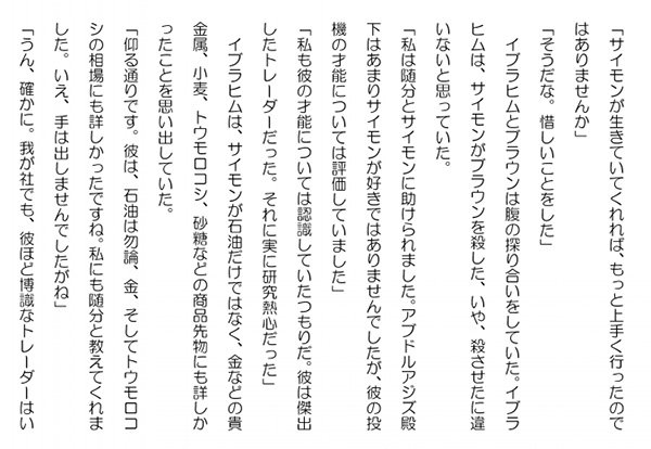 この作品はフィクションであり実在の人物団体等とは一切関係ありません。Copyright(C) 2008-2010 Kazuo KAWAHARA All rights reserved. 「サイモンが生きていてくれれば、もっと上手く行ったのではありませんか」「そうだな。惜しいことをした」 イブラヒムとブラウンは腹の探り合いをしていた。イブラヒムは、サイモンがブラウンを殺した、いや、殺させたに違いないと思っていた。「私は随分とサイモンに助けられました。アブドルアジズ殿下はあまりサイモンが好きではありませんでしたが、彼の投機の才能については評価していました」「私も彼の才能については認識していたつもりだ。彼は傑出したトレーダーだった。それに実に研究熱心だった」 イブラヒムは、サイモンが石油だけではなく、金などの貴金属、小麦、トウモロコシ、砂糖などの商品先物にも詳しかったことを思い出していた。「仰る通りです。彼は、石油は勿論、金、そしてトウモロコシの相場にも詳しかったですね。私にも随分と教えてくれました。いえ、手は出しませんでしたがね」「うん、確かに。我が社でも、彼ほど博識なトレーダーはいなかった。特に、連携して動いて貰う時などは重宝した」 ブラウンは、商品間だけではなく、為替、株との間の動きにも精通しているトレーダーでなければ、ブラウンの指示を正確に受け止めることは出来ないだろうと思っていたから、その限りにおいては、サイモンが最も使い易かった。しかし、サイモンが自分の裏の部分に入り込もうとしたことは許せなかった。「キジも鳴かずば撃たれまいに」と言う感覚だった。 「沙漠のたそがれ」は、世界的大ヒットになった。 どこの街でも、そのメロディを聞くことが出来た。レバノンのエイブルレコード、ロンドンのキングレコード、ともに、売上が鰻上りだった。 ラミアの兄、サードハリーリーも大満足だった。 お高くとまっていた、ハキムを焚き付けて納得させて、ロンドンのミカを巻き込んだのが功を奏した。ハキムが最初に評価した通りにしてしまっていたら、「沙漠のたそがれ」はお蔵入りで日の目を見ることはなかったろう。サウジ国内では、「沙漠のたそがれ」が販売禁止になっていたから、そのメロディが街頭を流れることは無かったものの、官憲の目を潜って、密かにメロディを聞くものがいたことも事実だった。特に、アルバハでは、アブドルアジズへの怨念もあったから、「沙漠のたそがれ」は密かに流行って行った。ファリファやガイス達は、こぞってそれを聞いた。 「ファリファ様、これがあのヤシン様の兄上、カラム様とカシム様のお作りになった曲ですか」 ガイスは密かに入手した海賊版の「沙漠のたそがれ」のCDを聞きながら、ファリファに言った。「良い曲ですね。世界的大ヒットになったのも良く判ります。サウジ内では販売禁止になっているけど、必ず、東部からこの西部までファンが広がって行くに違いありません。それは官憲が止めようとしても無理なことです。むしろ、販売禁止にすればするほど、聞きたいものも出て来るのが人情です」 ファリファはそうきっぱりと言った。人気ブログランキングに参加しています。クリックのほどよろしく