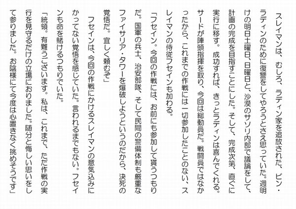 この作品はフィクションであり実在の人物団体等とは一切関係ありません。Copyright(C) 2008-2011 Kazuo KAWAHARA All rights reserved. スレイマンは、むしろ、ラディン家を追放された、ビン・ラディンのために復讐をしてやろうとさえ思っていた。週明けの明日土曜日、日曜日と、沙漠のサソリ内部で議論をして、計画の完成を目指すことにした。そして、完成次第、直ぐに実行に移す。成功すれば、きっとラディンは喜んでくれる。サードが陣頭指揮を取り、今回は総動員だ。戦闘員ではなかったから、これまでの作戦には一切参加したことのない、スレイマンの侍従フセインも加わる。「フセイン。今回の作戦には、お前にも参加して貰うつもりだ。国軍の兵士、治安部隊、そして民間の警備体制も厳重なファイサリア・タワーを爆破しようというのだから、決死の覚悟だ。宜しく頼むぞ」 フセインは、今回の作戦にかけるスレイマンの意気込みにかってない覚悟を感じていた。言われるまでもない。フセインも命を賭けるつもりでいた。「統領。有難うございます。私は、これまで、ただ作戦の実行を見守るだけの立場におりました。随分と悔しい思いをして参りました。お陰様にて今度は心置きなく挑めそうです」 フセインは、アラーの命に従い作戦を実行すれば、天国に行けるに違いないと思っていた。タワーの下で、自動小銃を持って警備をしている国軍の兵士に、その自動小銃で体を蜂の巣のようにされても構わない。それが犬死でなければもっと良いのだが。「そうか。悔しい思いをして来たか。しかし、アジトを守るのも重要な仕事だ。今回は、特別な作戦だから、皆で作戦に取り掛かろう。一緒に心置きなく戦おう。そして、ビン・ラディン様の悲願を達成しようではないか。きっとお喜びになって頂けるに違いない」 スレイマンは遠くパキスタンに思いを馳せていた。 スルタン達の乗ったサバーバンは、アブドルアジズ邸の前まで来ていた。アブドルアジズ邸の周囲は、三メートルはあろうかと思われる高い塀で囲まれている。そして、その塀の上には高圧電線が張り巡らされている。外からは、月光に照らし出された、鬱蒼と茂った木々が見えるだけだ。ゲートは勿論閉ざされている。街灯はあるが、ゲートの周囲は薄暗い。サバーバンはその前にス~と止まった。すると、サーチライトがサバーバンを照らし、急に周囲が明るくなった。ゲートを固めている番兵が塀の上にある櫓に姿を現した。スルタンは、サバーバンの助手席から身を乗り出し、番兵にゆっくりと手を振った。「アルバハのスルタンだ。殿下に急用で参った。夜も更けていることだし、ゲート内で待機しているから、至急取次ぎを頼む」 こんな夜更けに何事ですかと言われる前に、スルタンは機先を制した。後は、自分を知っている番兵であることを祈っていた。知らなければ知らないで、強行突破をするだけのことだったが、少しでも容易な方が良い。「これは、これは。シェイクではありませんか。どうなされました。早速、ゲートを開けますので、お待ち願えますか」 ゲートがギーという鈍い音をして少しずつ開いた。 サバーバンは、ゲート内の装甲車の前で停まった。装甲車には機銃が備え付けられ、兵士がそれを握っている。人気ブログランキングに参加しています。クリックのほどよろしく