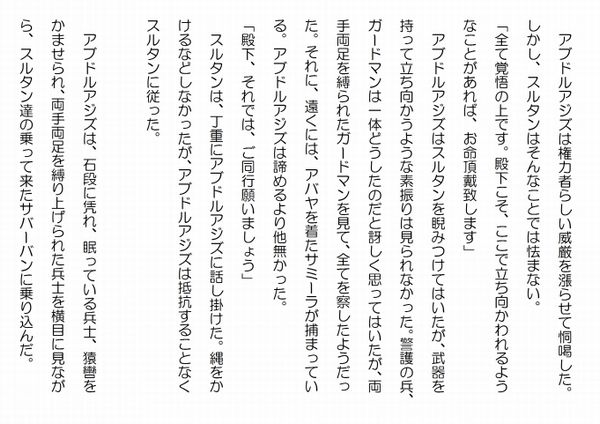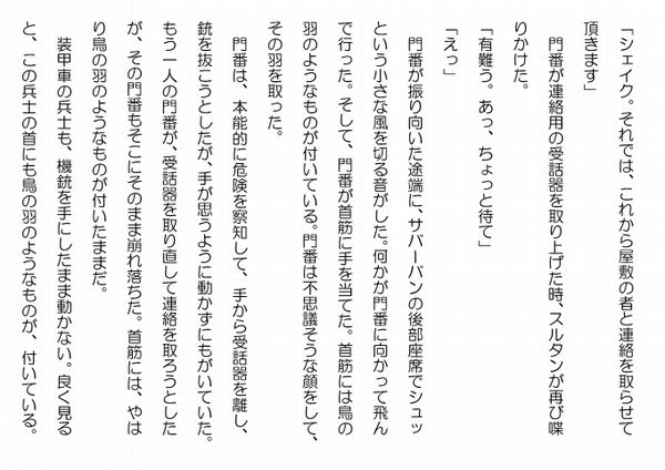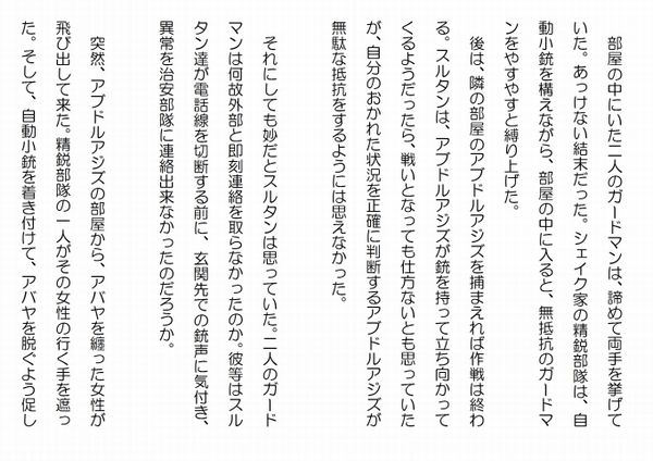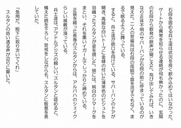この作品はフィクションであり実在の人物団体等とは一切関係ありません。Copyright(C) 2008-2011 Kazuo KAWAHARA All rights reserved. 石段を固める兵士達は状況を良く飲み込めてはいなかった。ゲートから異常を知らせる連絡が何も無かったのに、玄関の石段から数発の銃声が聞こえた。飛び出してみれば、いきなり正体不明のサバーバンが石段の前に停まっているのが見えた。二人の警備兵は石段の両脇で血を流すでもなく、まるで眠るように蹲っている。すると、兵士達が銃口を向けている、サバーバンのドアが開き、高級な白いトーブに金縁の付いた薄茶色のビシュトを羽織ったスルタンが姿を現した。頭には、純白のシマーグをまとい、それを黒いイガールでしっかりと締めている。正装を纏った長身のスルタンからは、アルバハのシェイクらしい威厳が漲っている。兵士達は、アブドルアジズの親しい、スルタンと認めると、構えた銃を下ろし、警戒をしながらも、スルタンに敬意を表していた。 「急用だ。殿下に取り次いでくれ」 スルタンの低い透る声が辺りに響いた。 一人の兵士が後ろを向いて玄関に入ろうとすると、シュッと言う音がして、その兵士の首筋に鳥の羽が付いた。兵士は、音のした方を振り向いたが、その動きは緩慢だった。そして、鳥の羽に触ったが、取り去るでもなく、よろよろと石段を降りて行った。 三人の兵士が、再び銃を構えようとしたが、その時までには、シュッと言う音が二つ鳴って、両脇の兵士の首に鳥の羽が付いた。残った兵士が、ようやくスルタンに向かって銃を構えた時には、サバーバンから銃声がして、兵士の脚から血が吹き出た。その兵士は、銃を空に撃ちながら、石段を転げ落ちた。次の瞬間、サバーバンから黒い制服に身を固めたシェイク家の精鋭部隊が飛び出し、屋敷の兵士達に銃口を突きつけた。首に羽を付けた兵士達は、緩慢な動作のまま、手を挙げて精鋭部隊のするに任せていた。 精鋭部隊は、手際良く兵士達に猿轡をかけ、両手を縛り上げた。鳥の羽を首に付けた兵士達は、次第に目がどんよりとして、そのままそこで眠ってしまった。脚から血を噴出していた兵士は、痛々しかったが、精鋭部隊に応急処置を受け、他の兵士のように猿轡をかけられ、両手、両足を縛り上げられた。 スルタン達は、アブドルアジズ邸の玄関に堂々と侵入した。アブドルアジズ邸の隅々まで承知していたスルタンは、ホールに入ると、そこから二階の寝室へと通じる大階段を駆け上がった。精鋭部隊も続く。 金曜日は休日だったから、警備が手薄だったのか、随分と容易に、二階まで侵入出来た。スルタンは、作戦を予定通りに実行出来たことに、満足していた。 後は、アブドルアジズの寝室の手前にある、ガードマンの部屋だけ攻略すれば良かった。手強い相手だが、二人という少人数だ。それに対し、こちらは五人の精鋭部隊が付いて来ている。戦わずとも勝敗は明らかだった。 スルタン達はガードマンの部屋の扉の前に立っていた。 精鋭部隊は扉の両脇を固めると一人がその扉を蹴飛ばした。大きな音をたてて分厚い木の扉が勢い良く内側に開く。 人気ブログランキングに参加しています。クリックのほどよろしく