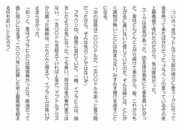 この作品はフィクションであり実在の人物団体等とは一切関係ありません。Copyright(C) 2008-2011 Kazuo KAWAHARA All rights reserved. 「シェイク。それでは、これから屋敷の者と連絡を取らせて頂きます」 門番が連絡用の受話器を取り上げた時、スルタンが再び喋りかけた。「有難う。あっ、ちょっと待て」「えっ」門番が振り向いた途端に、サバーバンの後部座席でシュッという小さな風を切る音がした。何かが門番に向かって飛んで行った。そして、門番が首筋に手を当てた。首筋には鳥の羽のようなものが付いている。門番は不思議そうな顔をして、その羽を取った。門番は、本能的に危険を察知して、手から受話器を離し、銃を抜こうとしたが、手が思うように動かずにもがいていた。もう一人の門番が、受話器を取り直して連絡を取ろうとしたが、その門番もそこにそのまま崩れ落ちた。首筋には、やはり鳥の羽のようなものが付いたままだ。装甲車の兵士も、機銃を手にしたまま動かない。良く見ると、この兵士の首にも鳥の羽のようなものが、付いている。装甲車に乗っていた他の兵士達は、機銃を持っている兵士が微動だにしないので、慌てて、銃を構えたが、遅かった。その時には、既に周りを、自動小銃を手にしたスルタンの部下達が固めていた。その兵士達は震えながら、銃を捨てると手を上に挙げた。あっと言う間の出来事だった。「ご苦労。素早く、正確な吹き矢だった。お陰で作戦通りにゲートを突破することが出来た。後は、屋敷を固めている治安部隊を残すだけだ。本隊は、ここのようには行かないだろうから、より慎重に望まなければならない。しかし、ここと同じように作戦通り攻めることが出来れば、何の心配も無い」スルタンは部下達の緊張を和らげようと、微笑を湛えながらぐるっと皆の顔を見回した。ある者は銃を上げ、ある者は、ただ頷いてスルタンに応えた。 イブラヒムは、アブドルアジズが二つ返事で原油先物取引への復帰を認めてくれるとは思ってもいなかった。アブドルアジズは終始ご機嫌だった。イブラヒムも、インタコンチネンタルの自室でご機嫌だった。思わず、笑みが込み上げて来るのを抑えることは出来なかった。原油相場もブラウンの言っていたように、三日続伸となった。四月二九日には、原油価格が、二〇〇八年以来の高値となった。アブドルアジズの機嫌は、ますます良くなることだろう。 「ブラウン会長。仰っていたように、原油相場は上昇気流に乗りましたね。この分だと、本当に、直に一五〇ドル、そして次は二〇〇ドルですね」 もう直ぐ、アブドルアジズ邸が襲われるなどとは夢にも思っていなかったから、イブラヒムも、ブラウンも陽気だった。「そうだ。わしも、ここまで直ぐに上昇するとは思ってはいなかった。笑いが止まらんよ。原油もそうだが、金はもっと凄いぞ。二一日に一五〇〇ドルを超えてから、その勢いは止まるところを知らん。今日は、一五五六・四ドルを記録した。毎日、毎日、史上最高値を更新している」 イブラヒムは金と聞いて俄かに後ろめたくなった。人気ブログランキングに参加しています。クリックのほどよろしく
