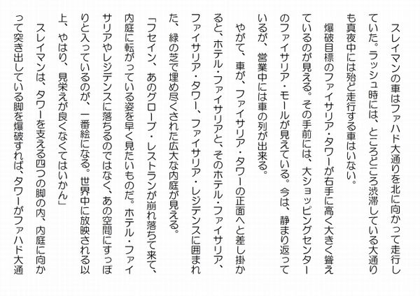 この作品はフィクションであり実在の人物団体等とは一切関係ありません。Copyright(C) 2008-2011 Kazuo KAWAHARA All rights reserved. スレイマンの車はファハド大通りを北に向かって走行していた。ラッシュ時には、ところどころ渋滞している大通りも真夜中には殆ど走行する車はいない。 爆破目標のファイサリア・タワーが右手に高く大きく聳えているのが見える。その手前には、大ショッピングセンターのファイサリア・モールが見えている。今は、静まり返っているが、営業中には車の列が出来る。 やがて、車が、ファイサリア・タワーの正面へと差し掛かると、ホテル・ファイサリアと、そのホテル・ファイサリア、ファイサリア・タワー、ファイサリア・レジデンスに囲まれた、緑の芝で埋め尽くされた広大な内庭が見える。「フセイン、あのグローブ・レストランが崩れ落ちて来て、内庭に転がっている姿を早く見たいものだ。ホテル・ファイサリアやレジデンスに落ちるのではなく、あの空間にすっぽりと入っているのが、一番絵になる。世界中に放映される以上、やはり、見栄えが良くなくてはいかん」 スレイマンは、タワーを支える四つの脚の内、内庭に向かって突き出している脚を爆破すれば、タワーがファハド大通りに向かって倒れて来て、内庭に転がるに違いないと思っていた。その脚の下は丁度、タワーの入口になっているから、攻撃するのにも好都合だ。 レジデンスに向かって緩やかに上って行く坂の上には、常に治安部隊の装甲車が一台止まっている。それを上手く葬り去れば、後は、入口に自動小銃を持った治安部隊の兵士がいるだけだ。レジデンスに向かって緩やかに上って行く坂の入口にはファイサリア・グループのチェックポイントがあるが、そこにいるのは、ファイサリアのセキュリティだから、強行突破は容易だ。 スレイマンは、大騒ぎになって、警察、治安部隊などが駆けつけるまでに決着を付けることが出来ると思っていた。イスタンブール・ヒルトンでは、裏口から自爆テロ要員が入って行った。今回も、スレイマン達が正面から攻撃している内に、ファイサリア・モールから入った女性の自爆テロ要員が渡り廊下を通って、ファイサリア・タワーのホールへと侵入する。営業時間内であれば、このルートは殆ど問題無く通過出来る。モールから渡り廊下への入口には、ファイサリアのセキュリティがいるが、金属探知機を持っている分けではない。買物客を装った自爆テロ要員が、そこを通過するのはそれほど難しいことではないだろう。 スレイマンは、車がタワーの前を通過して本を模ったファイサリア・ファウンデーションのビルの前に来るまでのほんの僅かな時間に、練りに練った構想を思い起こしていた。 スレイマン達の車は、スピードを上げると、ファハド大通りを北上して行った。シェラトンを過ぎると、直に、北環状道路との大立体交差点へと差し掛かる。車は、緩やかに右手に曲がると、そのまま北環状道路へと入って行った。ファイサリア・タワー、キングダム・タワーを時折右手に見ながら環状道路を進むと、やがて、空港へ向かう道路が左手に別れる場所へとやって来るが、車は、直進してダンマーン道路へと入って行く。 スレイマンは、前代の沙漠のサソリの統領、"月の欠片"だった義兄弟のカシムが傷ついた体で、この道を通ってリヤドに帰ったのかもしれないと、ふと、思った。 そして、ファハド大通りを南下して郊外の自宅に戻った。人気ブログランキングに参加しています。クリックのほどよろしく