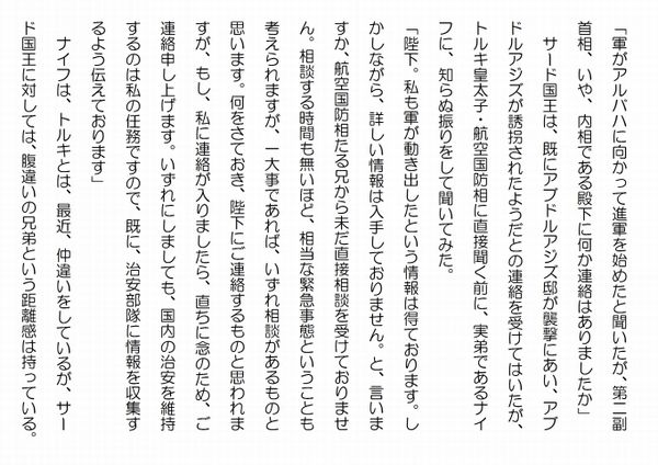 この作品はフィクションであり実在の人物団体等とは一切関係ありません。Copyright(C) 2008-2011 Kazuo KAWAHARA All rights reserved. 「軍がアルバハに向かって進軍を始めたと聞いたが、第二副首相、いや、内相である殿下に何か連絡はありましたか」 サード国王は、既にアブドルアジズ邸が襲撃にあい、アブドルアジズが誘拐されたようだとの連絡を受けてはいたが、トルキ皇太子・航空国防相に直接聞く前に、実弟であるナイフに、知らぬ振りをして聞いてみた。「陛下。私も軍が動き出したという情報は得ております。しかしながら、詳しい情報は入手しておりません。と、言いますか、航空国防相たる兄から未だ直接相談を受けておりません。相談する時間も無いほど、相当な緊急事態ということも考えられますが、一大事であれば、いずれ相談があるものと思います。何をさておき、陛下にご連絡するものと思われますが、もし、私に連絡が入りましたら、直ちに念のため、ご連絡申し上げます。いずれにしましても、国内の治安を維持するのは私の任務ですので、既に、治安部隊に情報を収集するよう伝えております」 ナイフは、トルキとは、最近、仲違いをしているが、サード国王に対しては、腹違いの兄弟という距離感は持っている。腹立たしいと思っても、実の兄弟を優先することは否めない。ナイフには、ストレスが溜まっていた。それに、トルキの判断には、最近、疑問に思われることが多々出ている。しかし、それをサード国王に言うわけには行かない。サード国王が自分を第二副首相に任命したのには、国王なりに、そんな情報を入手したためではないかとは思われるが、それと自分のトルキに対する疑問を伝えるのとでは、大きく異なる。「頼むぞ。わしも事と次第によっては、国家警備隊を出動させなければならないとも思っている」 この言葉はナイフの胸に突き刺さった。国内の武力を二分する一方の雄・国家警備隊が動き出せば大変なことになる。近代装備で、外人部隊の力も借りている軍も、士気とまとまりという点では、警備隊に劣る。軍も圧倒的という分けではない。それに、その他に、国内の治安を請け負う、ナイフの持つ治安部隊、警察がある。仮に軍と警備隊が対立するようなことがあれば、自分がどう動くか判断しなければならない。その際、ロイヤルファミリー内だけではない、今の時代は国民がどう判断するかも考慮しなければならない。 ナイフは難しい判断を強いられることになる。そのためにも、詳細な情報収集が必要だった。アブドルアジズ邸が襲われ、アブドルアジズが誘拐されたようだという情報はどこまで正しいのか。そして、何故、誘拐されたのか。アルバハのシェイク家が襲ったとすれば、それ自体は完全な違法行為で厳罰に値する。しかし、トルキが直ぐに軍を動かした気持ちは分かるが、仮にそれが事実とすれば、その襲撃事件を担当するのは自分ではないか。自分をないがしろにして、事を進めるのは大問題だ。トルキに問い質す必要があると思ってはいるが、出来れば、トルキから自発的に相談して来て欲しいと思っていた。強権発動をして、警察を入れる分けには行かないし、ましてや、治安部隊を動かす分けには行かない。ナイフは苛立っていた。 サード国王は、アルバハのシェイク・スルタンを信じたいと思っていた。しかし、アブドルアジズ邸襲撃が事実とすれば、スルタンを助けることは出来ない。悩ましい気持ちでいる国王の、執務室の電話が鳴った。スルタンからだった。人気ブログランキングに参加しています。クリックのほどよろしく