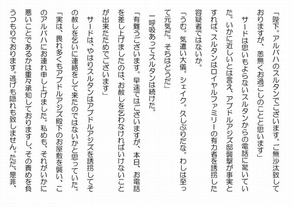 この作品はフィクションであり実在の人物団体等とは一切関係ありません。Copyright(C) 2008-2011 Kazuo KAWAHARA All rights reserved. 「陛下。アルバハのスルタンでございます。ご無沙汰致しておりますが、恙無くお過ごしのことと思います」 サードは思いもよらないスルタンからの電話に驚いていた。いかに近しいとは言え、アブドルアジズ邸襲撃が事実とすれば、スルタンはロイヤルファミリーの有力者を誘拐した容疑者ではないか。「うむ。気遣い大儀。シェイク。久しぶりだな。わしは至って元気だ。そちはどうだ」一呼吸あってスルタンは続けた。「有難うございます。早速ではございますが、本日、お電話を差し上げましたのは、お赦しを乞わなければいけないことが出来たためでございます」 サードは、やはりスルタンはアブドルアジズを誘拐してその赦しを乞いに連絡をして来たのではないかと思っていた。「実は、畏れ多くもアブドルアジズ殿下のお屋敷を襲い、このアルバハにお連れ申し上げました。私めも、それがいかに悪いことであるかは重々承知しておりますし、その責めを負うつもりでおります。逃げも隠れも致しません。ただ、是非、お連れした分けをお聞き頂ければ幸いと思っております。申し開きの機会を頂ければと厚かましくも思っておるところでございます」 スルタンは、今、事細かに説明するつもりは無かった。「シェイク。困ったことをしてくれたな。そもそも、そちも申しておる通り、襲撃は大罪だ」 本来は問答無用、申し開きなど論外だった。「誠に申し訳ございません。しかしながら、陛下もご存知の通り、このスルタンには政府に対しまして弓を引くようなつもりは毛頭ございません。当シェイク家からは、アルカイダ・サウジ支部の沙漠のサソリの統領を二人までも出しておりまして言えた義理ではございませんが・・・」 サードは自分が国王になる時のスルタンの尽力を決して忘れてはいない。陰で即位を阻止しようとしたアブドルアジズ派の一部を説得するなど獅子奮迅の活躍振りだった。「残念なことだ。特に、スレイマンについては、リハビリセンターで優秀な成績を修め、その美しい声でコーラン読誦をリードしたとのことだ。勿論、教義理解も最優秀だった。アブドルアジズの力添えもあり、無事解放されたのに、元の木阿弥になってしまった」「仰せの通りでございます。しかしながら、ご存知の通り、故父シェイク・イスマイルは敬虔なモスレムでしたし、その教義に真摯に従っておりました。わがシェイク家は、アルバハの民に範を垂れる立場でもあります」 サードは、スルタンに言われるまでも無く、シェイク家の歴史と伝統を承知していたし、そう言う、スルタンこそは、サウジ国内にも知れ渡ったイマームでもあった。スルタンを敬愛するのは、アルバハの民に限ったものではない。「シェイク。わしもそれは十分に承知しておる。それが、今回は一体どうしたというのだ」「陛下。トルキ皇太子・航空国防相の命により軍がこのアルバハに向かったという情報を軍におります義弟のムハンマドから聞きました。ムハンマドによりますと、それを陛下が承知しておられない節もあるとのこと。それは本当でございましょうか」 サードはスルタンの問いに即答は出来なかった。人気ブログランキングに参加しています。クリックのほどよろしく