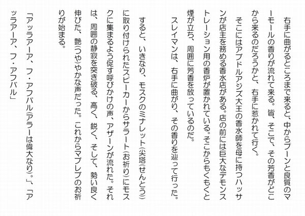 この作品はフィクションであり実在の人物団体等とは一切関係ありません。Copyright(C) 2008-2011 Kazuo KAWAHARA All rights reserved. 右手に曲がるところまで来ると、中からプーンと良質のマーモールの香りが流れて来る。皆、そこで、その芳香がどこから来るのだろうかと、右手に惹かれて行く。 そこにはアブドルアジズ大王の香水師を母に持つハッサンが店主を務める香水店がある。店の前には巨大なデモンストレーション用の香炉が置かれている。そこからもくもくと煙が立ち、周囲に芳香を放っているのだ。 スレイマンは、右手に曲がり、その香りを辿って行った。 すると、いきなり、モスクのミナレット(尖塔(せんとう))に取り付けられたスピーカーからサラート(お祈り)にモスクに集まるよう促す呼びかけの声、アザーンが流れた。それは、周囲の静寂を突き破る、高く、鋭く、そして、勢い良く伸びた、艶(つや)やかな声だった。これからマブレブのお祈りが始まる。 「アッラアーア、フ・アフバル(アラーは偉大なり)。」、「アッラアーア、フ・アフバル」「アッラアーア、フ・アフバル」、「アッラアーア、フ・アフバル」「アシュハド・アン・ラ・イラハ・イラッラアーアアアアアアアー(アラーの他に神は無しと私は証言する。)」「アシュハド・アン・ラ・イラハ・イラッラアーアアアアアアアー」「アシュハド・アンナ・ムハンマド(マホメット)・ラスルウウーラアアアー(ムハンマドはアラーの使徒であると私は証言する)。」「アシュハド・アンナ・ムハンマド・ラスルウウーラアアアー」・ ・・・・ 澄んだその声は気高さに満ちていて、敬虔なモスレムで、名ムアッジンでもあるスレイマンの心を捉えた。 -さすがに首都リヤド中心部にあるモスクのムアッジンだ。良い声だし、正確な音程、そして正統な響きを持っている。こんなアザーンを聞くと、これからの計画実行に力が入るというものだ 目の前の香水店の店主ハッサンが店の扉を閉め、鍵を掛けていた。これから、マグレブのお祈りに行くつもりなのだろう。 「アッサラーム・アレイコム」 ハッサンはスレイマンを目にすると、親しげに挨拶をした。「アレイコム・サラーム」 スレイマンは挨拶を返した。モスクとは反対の方向に行こうとしているスレイマンに首を傾げながら、ハッサンはモスクへと向かった。ハッサンは、歩きながら、スレイマンが旅人でモスクの場所も知らないのだろうなどと、勝手に納得していた。 スレイマンは、アルコザマ・センターの入口をじっと見詰めていた。入口のセキュリティは高そうだった。人気ブログランキングに参加しています。クリックのほどよろしく