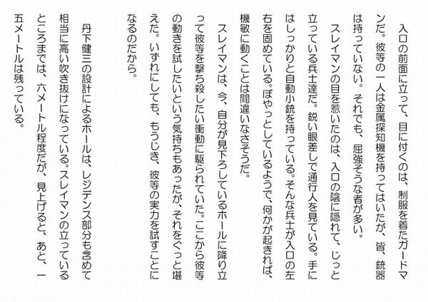 この作品はフィクションであり実在の人物団体等とは一切関係ありません。Copyright(C) 2008-2011 Kazuo KAWAHARA All rights reserved. 入口の前面に立って、目に付くのは、制服を着たガードマンだ。彼等の一人は金属探知機を持ってはいたが、皆、銃器は持っていない。それでも、屈強そうな者が多い。 スレイマンの目を惹いたのは、入口の陰に隠れて、じっと立っている兵士達だ。鋭い眼差しで通行人を見ている。手にはしっかりと自動小銃を持っている。そんな兵士が入口の左右を固めている。ぼやっとしているようで、何かが起きれば、機敏に動くことは間違いなさそうだ。 スレイマンは、今、自分が見下ろしているホールに降り立って彼等を撃ち殺したい衝動に駆られていた。ここから彼等の動きを試したいという気持ちもあったが、それをぐっと堪えた。いずれにしても、もうじき、彼等の実力を試すことになるのだから。 丹下健三の設計によるホールは、レジデンス部分も含めて相当に高い吹き抜けになっている。スレイマンの立っているところまでは、六メートル程度だが、見上げると、あと、一五メートルは残っている。 イッシャーのお祈りが終われば、ここでも銃撃戦が繰り広げられることになる。自動小銃を持った兵士を射殺出来れば、後は簡単だ。 吹き抜けの両側にはレジデンスの通路があるが、恐らく住民達は何が起こったのかと、そこからホールを見下ろすに違いない。そして、逃げ惑うことだろう。スレイマンにはその混乱振りが今から想像出来た。 そんな時に自分の持ち場を離れてはいけないのが鉄則だが、ホテル、レジデンスの入口にいる装甲車の兵士は別として、タワーのホールにいる兵士達は自動小銃を手に応援に駆けつけることだろう。 スレイマンはそれを見届けてから、悠然と自爆テロリスト二人にタワーのホールに向かうよう指示をする。後は簡単だ。手薄になったタワーのホールにいる数人の兵士をスレイマンが片付ければ良い。自爆テロリストは、タワーのホールを抜け外側にある左右の脚元に一人づつ行って、そこで自爆する。それで、中庭側の二つの脚元が破壊される筈だ。そうなれば、脚が支えていた、タワーの天辺にあるグローブ・レストランがゆっくりと中庭に崩れ落ちる。 スレイマンは、その光景を思い描いていた。そして、それがCNNなどのメディアを通じて全世界へと報道される。パキスタンにいるビンラディンもテレビで目にするに違いない。ビンラディンの父親の会社が請け負って建設した、サウジの近代化を象徴するような巨大建造物の一つが爆破される。ビンラディンは複雑な心境になるだろうが、アルカイダとしては、九・一一以来の大事件を引き起こすことになる。 それで、ビンラディンを勘当した父親との決別になるし、ビンラディンを追放したサウジ家への報復になる。 シュミットは、まだ、ファイサリア・レジデンスのシュルツの部屋にいた。サイードは、マグレブのお祈りから帰って来ていた。「サイードは、マグレブのお祈りから帰って来たが、もう直に、イッシャーのお祈りに出掛けることになる。いつものことだが、この間は、たいしたことは何も出来ない」 サイードは苦笑いしながら話を聞いていた。人気ブログランキングに参加しています。クリックのほどよろしく