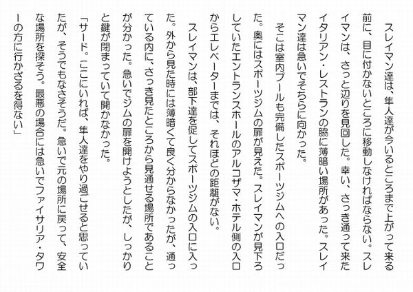この作品はフィクションであり実在の人物団体等とは一切関係ありません。Copyright(C) 2008-2011 Kazuo KAWAHARA All rights reserved. スレイマン達は、隼人達が今いるところまで上がって来る前に、目に付かないところに移動しなければならない。スレイマンは、さっと辺りを見回した。幸い、さっき通って来たイタリアン・レストランの脇に薄暗い場所があった。スレイマン達は急いでそちらに向かった。 そこは室内プールも完備したスポーツジムへの入口だった。奥にはスポーツジムの扉が見えた。スレイマンが見下ろしていたエントランスホールのアルコザマ・ホテル側の入口からエレベーターまでは、それほどの距離がない。 スレイマンは、部下達を促してスポーツジムの入口に入った。外から見た時には薄暗くて良く分からなかったが、通っている内に、さっき見たところから見通せる場所であることが分かった。急いでジムの扉を開けようとしたが、しっかりと鍵が閉まっていて開かなかった。「サード。ここにいれば、隼人達をやり過ごせると思っていたが、そうでもなさそうだ。急いで元の場所に戻って、安全な場所を探そう。最悪の場合には急いでファイサリア・タワーの方に行かざるを得ない」 スレイマン達は急いで元の場所に戻り、もう一度辺りを見回した。「統領、たった今、あの日本人達がエレベーターに乗り込みました」 サードは、目撃した通りスレイマンに報告した。もう、一刻の猶予もない。 スレイマンは、イタリアン・レストランには扉があるわけではなく、お祈りの時間に看板を出しカーテンを降ろしているだけであることに気付いた。そのカーテンも下まで届くほど長いものではない。下から五〇センチほどは空いている。じっと耳を澄ませば奥の方から微かな物音も聞こえて来る。 スレイマンは、きっと、お祈りの時間も外国人などを対象に営業を続けていて、新たな客を中に入れないだけだろうと、直感的に判断した。「サード。あのレストランに入るぞ」 スレイマン達は小走りでレストランに飛び込んだ。 音に気付いて、支配人らしい外国人がやって来た。「いらっしゃいませ。申し訳ありませんが、現在はお祈りの最中ですから閉めさせて頂いております」 イタリア人のように見える、その男が丁重にそう断った。「支配人。承知の上だ」 スレイマンは、さっと一〇〇リヤル紙幣を丸めると、それをその支配人らしい男の手に握らせた。男は、最初は迷惑そうだったが、その手に握った紙幣を、静かにポケットにしまうと、ニヤッと笑った。スレイマンの勘は当たった。 その店は、お祈りの時間も、外国人を中心として、一応断るが、来店してしまったものを最後まで断るようなことはしないのだ。ただ、相手がサウジ人のように見えたので、より慎重になっただけだろう。「それでは、お席をご用意させて頂きますので、申し訳ありませんが、ここにお座りになってお待ち頂けますか」支配人らしい男は、そう言うと、そそくさと奥へと入って行った。奥からは、外国人の談笑する声が聞こえて来た。スレイマン達が椅子に座ると、外の通路を歩いて行く隼人達の足が、降りたカーテンの向こうに見えた。 人気ブログランキングに参加しています。クリックのほどよろしく!