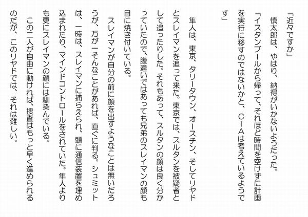 この作品はフィクションであり実在の人物団体等とは一切関係ありません。Copyright(C) 2008-2011 Kazuo KAWAHARA All rights reserved. 「近々ですか」 慎太郎は、やはり、納得がいかないようだった。「イスタンブールから帰って、それほど時間を空けずに計画を実行に移すのではないかと、CIAは考えているようです」 隼人は、東京、タリータウン、オースチン、そしてリヤドとスレイマンを追って来た。東京では、スルタンを被疑者として追ったりした。それもあって、スルタンの顔は良く分かっていたので、腹違いではあっても兄弟のスレイマンの顔も目に焼き付いている。 スレイマンが自分の前に顔を出すようなことは無いだろうが、万が一そんなことがあれば、直ぐに判る。シュミットは、一時は、スレイマンに捕らえられ、頭に通信装置を埋め込まれたり、マインドコントロールをされていた。隼人よりも更にスレイマンの顔には馴染んでいる。 この二人が自由に動ければ、捜査はもっと早く進められるのだが、このリヤドでは、それは難しい。「あまり時間がないようですが、お陰様で、ようやく、リヤドの街中に出ることが出来ましたので、これからペースを上げることが出来ます。見ていて下さい。きっと、このタワーを沙漠のサソリの手から守りますよ」 隼人は、慎太郎の部屋からタワーを見上げた。慎太郎の部屋は、タワーの橋元に近かったから、見上げると、首が痛くなるほどだった。慎太郎、隼人達は、イッシャーのお祈り後に、その橋元が狙われているなどとは全く知る由もない。この部屋に残っていれば、確実に爆風で飛ばされてしまう。 スレイマンは、イッシャーのお祈りに向かう大王の香水師ハッサンと、また会ってしまった。「アッサラーム・アレイコム」 今度は、スレイマンから挨拶をした。「アレイコム・サラーム」 ハッサンは、また、モスクとは反対の方向に行こうとしているスレイマンに首を傾げていた。スレイマンは、ハッサンが自分のことを憶えているなどとは思ってもいなかった。商店主が、通行人の顔など覚えている分けが無い、そう思っていた。 ハッサンは、アルコザマセンターの出口から、ファイサリアモールとモスクを繋ぐ、総ガラス張りの渡り廊下へと出た。そこにはモスクへと向かう人々がぞろぞろと歩いていた。ハッサンは、何気なくモールの方に顔を向けて、目を輝かせた。そこには慎太郎の姿があったからだ。 慎太郎も嬉しそうだった。リヤド出張の度に、ハッサンの店を訪れ、日本への土産に香水を買ったりしてはいたが、暫くご無沙汰だった。「アッサラーム・アレイコム」「アレイコム・サラーム」 二人は、アラブ式に抱擁をしていた。大柄なハッサンの体が揺れる。頬への軽いキスもいつもの通りだ。そんな二人を微笑みながら隼人達は眺めていた。慎太郎は、隼人達の宿泊するアルコザマに行くところだった。ハッサンはお祈り後に店に来るよう勧めると、そそくさとモスクへと向かった。 人気ブログランキングに参加しています。クリックのほどよろしく