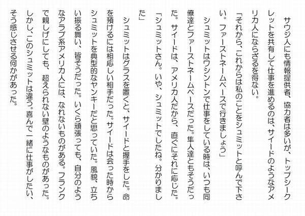この作品はフィクションであり実在の人物団体等とは一切関係ありません。Copyright(C) 2008-2011 Kazuo KAWAHARA All rights reserved. サウジ人にも情報提供者、協力者は多いが、トップシークレットを共有して仕事を進めるのは、サイードのようなアメリカ人にならざるを得ない。「それから、これからは私のことをシュミットと呼んで下さい。ファーストネームベースで行きましょう」 シュミットはワシントンで仕事をしている時は、いつも同僚達とファーストネームベースだった。隼人達ともそうだった。サイードは、アメリカ人だから、直ぐにそれに応じた。「シュミットさん。いや、シュミットでしたね。分かりました」 シュミットはグラスを置くと、サイードと握手をした。命を預けるには相応しい相手だった。サイードは会った時からシュミットを典型的なヤンキーだと思っていた。風貌、立ちい振る舞い、皆そうだった。いくら頑張っても、自分のようなアラブ系アメリカ人には、なれないものがある。フランクで親しげにしても、超えられない壁のようなものがあった。しかし、このシュミットは違う。喜んで一緒に仕事がしたい、そう感じさせる何かがあった。 二人のやりとりを微笑ましげに見ていたシュルツが口をはさんだ。「シュミットさん。いや、シュミット。わしのこともシュルツと呼んでくれ」 サウジ・ヘクテル社の社長、シュルツにもそんなことを言わせるような親しげな雰囲気が出来上がっていた。シュミットは頭を掻いていた。「これはどうも。有難いのですが、さすがにシュルツさんには、シュルツというのはどうも・・・う~ん。あっ、そうだ。それじゃ、プレジデントではどうですか」 サイードはともかく、サウジ現地法人とは言え、世界的大企業の社長であるシュルツに対しては、ファーストネームベーシスという分けには行かないと、シュミットは思っていた。「そうですか。そうおっしゃるのであれば、そうしておきましょう。ところで、もう少しすると、マグレブのお祈りです。サイードはいつもホテル・ファイサリアの裏のモスクまで行っていますが、今日は、隣の部屋で済ませてくれるそうです。ちょっと失礼しますがお許しください」 そこで、シュルツは時計を見た。「マグレブのお祈りが終わる頃には、我が同僚と米海軍特殊部隊(SEALS)がパキスタンのアボタバードに向けスタンバイだ。そして、イッシャーのお祈りの頃には、アフガンを飛び立っていることだろう」 シュルツは、また、シュミットに向けてワイングラスを掲げた。サウジ内でビンラディン関連の情報収集を続けて来たシュルツにとっては、感慨深いものがあった。自分達の努力がようやく実ることになる。 月の欠片・スレイマン達は、ファイサリア・モールに到着していた。未だ、買い物客でごった返していたが、マグレブのお祈りになれば、人波は途絶える。今は、モールの従業員の一部も、ホテル・ファイサリアの裏手にあるモスクに向かってぞろぞろと歩き始めていた。 スレイマン達は、その人混みに紛れ込んでモールからモスクへの連絡橋を渡った。タワーのホールは左手だが、今はそこをやり過ごして右手に入り様子を見ることになっている。 人気ブログランキングに参加しています。クリックのほどよろしく