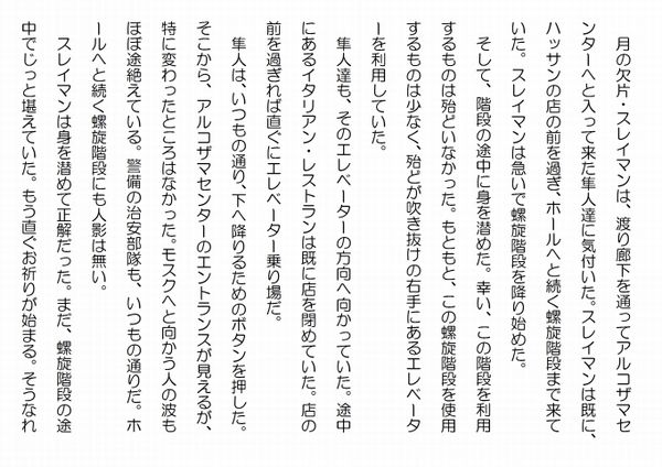 この作品はフィクションであり実在の人物団体等とは一切関係ありません。Copyright(C) 2008-2011 Kazuo KAWAHARA All rights reserved. 月の欠片・スレイマンは、渡り廊下を通ってアルコザマセンターへと入って来た隼人達に気付いた。スレイマンは既に、ハッサンの店の前を過ぎ、ホールへと続く螺旋階段まで来ていた。スレイマンは急いで螺旋階段を降り始めた。 そして、階段の途中に身を潜めた。幸い、この階段を利用するものは殆どいなかった。もともと、この螺旋階段を使用するものは少なく、殆どが吹き抜けの右手にあるエレベーターを利用していた。 隼人達も、そのエレベーターの方向へ向かっていた。途中にあるイタリアン・レストランは既に店を閉めていた。店の前を過ぎれば直ぐにエレベーター乗り場だ。 隼人は、いつもの通り、下へ降りるためのボタンを押した。そこから、アルコザマセンターのエントランスが見えるが、特に変わったところはなかった。モスクへと向かう人の波もほぼ途絶えている。警備の治安部隊も、いつもの通りだ。ホールへと続く螺旋階段にも人影は無い。 スレイマンは身を潜めて正解だった。まだ、螺旋階段の途中でじっと堪えていた。もう直ぐお祈りが始まる。そうなれば、人影は全く無くなる。 「今、シュミットは、シュルツの部屋にいます。これからアルコザマホテルに戻りますが、その頃には、何か連絡が入るかもしれません。なにしろ、シュルツは、このリヤドで沙漠のサソリについて最も豊富な情報を持っている人物ですからね」 隼人は、時田達とエレベーターホールを歩きながら、慎太郎に話し掛けていた。「いや~。驚きましたよ。あのシュルツがCIAの特別捜査官だったなんて。前にレジデンスに住んでいて、ときたま廊下などであったりしていましたが、彼は奥さんといつも一緒で、普通の実業家のように見えましたがね。裏の顔なんてちっとも気付きませんでした」「それは、そうですね。簡単にバレてしまうようなことは決してしませんから。アメ大でも、ほんの一握りの人しか知らないんですよ」 エレベーターホールを抜けると、通りを隔てて向かいがアルコザマホテルだ。その通りには、車が高速で走れないように、帯状に盛り上がった車止めが、ところどころにある。オレイヤ側の入口にはチェックポイントが置かれている。 隼人達は、それを横目に見ながら、向かいのアルコザマホテルの通用口へと歩いていった。 スレイマンは、そっと、螺旋階段からアルコザマセンターのホールを覗いて見た。既に、隼人達の姿は見えなかった。それを確認すると、ゆっくりとホールへと降りていった。吹き抜けを見下ろす通路には、沙漠のサソリの仲間が顔を現していた。彼等は、イッシャーのお祈りが終わり、小一時間もすれば、ホールのエントランスを固める兵士達を奇襲する。スレイマンは、ホールに降り立ち、彼等の方を見上げた。通路の仲間は、スレイマンを見て頷いている。 スレイマンは、これまでにも、何度か、下見をしているが、計画を実行する直前の今は、かつてなく緊張していた。それは通路にいる仲間達も同じだろう。 スレイマンはエントランスに向かって歩き始めた。人気ブログランキングに参加しています。クリックのほどよろしく