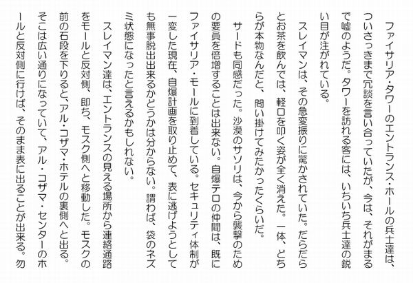 この作品はフィクションであり実在の人物団体等とは一切関係ありません。Copyright(C) 2008-2011 Kazuo KAWAHARA All rights reserved. ファイサリア・タワーのエントランス・ホールの兵士達は、ついさっきまで冗談を言い合っていたが、今は、それがまるで嘘のようだ。タワーを訪れる客には、いちいち兵士達の鋭い目が注がれている。 スレイマンは、その急変振りに驚かされていた。だらだらとお茶を飲んでは、軽口を叩く姿が全く消えた。一体、どちらが本物なんだと、問い掛けてみたかったくらいだ。 サードも同感だった。沙漠のサソリは、今から襲撃のための要員を倍増することは出来ない。自爆テロの仲間は、既にファイサリア・モールに到着している。セキュリティ体制が一変した現在、自爆計画を取り止めて、表に逃げようとしても無事脱出出来るかどうかは分からない。謂わば、袋のネズミ状態になったと言えるかもしれない。 スレイマン達は、エントランスの見える場所から連絡通路をモールと反対側、即ち、モスク側へと移動した。モスクの前の石段を下りると、アル・コザマ・ホテルの裏側へと出る。そこは広い通りになっていて、アル・コザマ・センターのホールと反対側に行けば、そのまま表に出ることが出来る。勿論、チェックポイントがあるが、ホテル側に比べれば警備は手薄のように見える。最後の手段として、皆で一斉にそこを突破するという選択がありそうだった。 スレイマン達は、それを確認すると、また、モスクへの石段を上った。 石段の上でスレイマンはサードや若い戦士達の顔をまじまじと見た。誰の顔にも迷いが無いようだった。サードだけは、スレイマンの心の動きが分かっていた。「統領、今回の爆破計画はラディン様の弔い合戦になりましたね。爆破計画の成功がアメリカ、そしてサウジ政府に対する報復に繋がりますし」 サードは、スレイマンの迷いを払拭するのに懸命だった。「うむ。そうだな。天国のラディン様もきっと喜んでくれることだろう」 スレイマンの心は定まった。例え、警備が強化されたにしても、予定通り、ファイサリア・タワー爆破計画を実行する。行くも帰るも容易ではない。もともと、そんなものだったが、警備体制の強化により、ますます厳しくなった。「それでは、予定通り、我等が爆弾を抱えた仲間を誘導して、エントランスの兵士達を一掃致します。警備の兵隊は増えましたが、何と言うことはありません。後は、仲間がタワーを支える脚元に行って自爆してくれればおしまいです」 若い戦士のリーダー格・マスードが力強くそう言って、ニヤリと笑った。他の戦士もそれを聞いて頷いている。「マスード。頼むぞ」 スレイマンは動き出した戦士達とともに、タワーのエントランスへと向かった。時間も遅かったので、連絡通路には人影が殆ど無かった。 向かいのファイサリア・モールの出入口から、一組の男女が歩いて来る。先頭のマスードが、その男女に合図を送ると、その男女が合図を返した。この男女が自爆テロリストだった。徐々に、男女と戦士達の距離が狭まって行く。 やがて、両者は、ファイサリア・タワーのエントランスへの入口で会うと、一緒にエントランスへと入った。スレイマン達が入口から覗くと、マスード達が兵士達の尋問を受けているところだった。