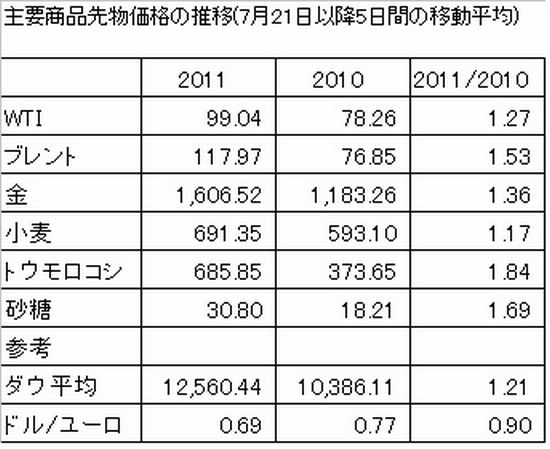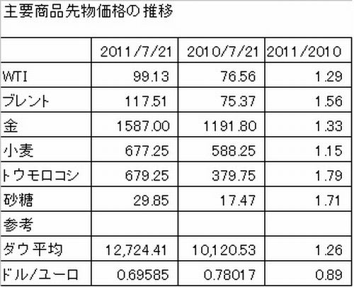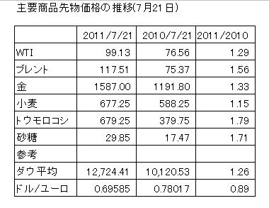 21日のWTI価格(終値)は、結局、73セント高のバレル当り99.13ドルまで上昇した。ヨーロッパの信用不安の緩和、IEAによる追加協調備蓄取り崩しに対する否定的見解が上昇の主因だという。 いつもながら???の付く理屈だが、昨年、一昨年と市場を支配して来た株高、ドル安の二大金融要因があったことは確かなことだ。一時は100ドルを超えたということだから、良くぞ、ここで収まったということだろう。 投機のブレントは、息切れで117ドル台へと低下した。金先物も下げた。まあ、ここのところ高すぎたというのが本当のところだろう。9.9ドル安のオンス当り1587ドル丁度だった。退潮ムードにある。 ちょっと、単一時点の比較で恐縮だが、主要商品先物の価格を一年前と比較してみた。ここでは、原油価格高騰を、二大金融要因にあると書き続けて来たが、その観点から見ても興味深い結果になっている。 アンケート、「100ドル原油時代はまた来るか?」に、ぜひ投票のほどを! http://blog.with2.net/vote/?m=v&id=17487