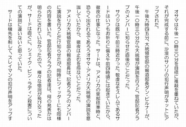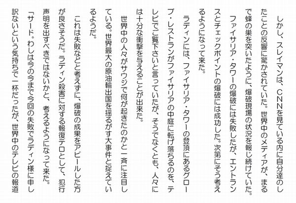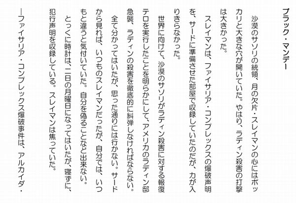 この作品はフィクションであり実在の人物団体等とは一切関係ありません。Copyright(C) 2008-2011 Kazuo KAWAHARA All rights reserved. ブラック・マンデー 沙漠のサソリの統領、月の欠片・スレイマンの心にはポッカリと大きな穴が開いていた。やはり、ラディン殺害の打撃は大きかった。スレイマンは、ファイサリア・コンプレックスの爆破声明を、サードに準備させた部屋で収録していたのだが、力が入りきらなかった。世界に向けて、沙漠のサソリがラディン殺害に対する報復テロを実行したことを明らかにして、アメリカのラディン邸急襲、ラディンの殺害を徹底的に糾弾しなければならない。全て分かってはいたが、思った通りには行かない。サードから見れば、いつものスレイマンだったが、自分では、いつもと違うと気付いていた。自分を偽ることなど出来ない。とっくに時計は、二日の月曜日になってはいたが、寝ずに、犯行声明を収録している。スレイマンは焦っていた。-ファイサリア・コンプレックス爆破事件は、アルカイダ・サウジ支部、我が「沙漠のサソリ」の犯行である。これは、我が聖なる戦士・シェイク・ビン・ラディンに対する圧制者・悪魔の蛮行に報いるための最初の行動であって、これからも未来永劫続くことになる。シェイクの血は、我々だけではなく、全モスレムにとって、より高貴なものであって、全能の神アラーのご加護の下、アメリカ人及びその協力者を、その国内外において、追い掛けて、処刑することを誓う。我々は、アメリカ人に対し、シェイクの家族を傷付けることなく、また、シェイクの遺体を傷付けず、そのまま、家族に渡すよう警告する スレイマンは一気に喋った。スレイマン自身には言い足りないことが山ほどあったが、サードは、満足気だった。サードは笑顔でスレイマンにキューを出していた。 オサマ・アメリカ大統領は、オーバルオフィスで、午後一〇時三〇分用の原稿を書いていた。何度も何度も推敲を繰り返していた。九・一一以来、溜まっていた国民の鬱憤を晴らすような内容でなければならない。-こんばんは。今夜、私は、アメリカ国民と世界に対し、アメリカが、数千人もの罪なき男性、女性、そして子供達の殺害を指示したアルカイダの指導者、オサマ・ビンラディンを殺害した作戦を実施した報告ができます オサマ大統領は冒頭の部分には何の迷いも無かった。-晴れ渡った九月の一日が、アメリカ国民に対する、我が国の歴史上最悪の攻撃によって、暗闇と化したのは、一〇年ほど前のことでした。九・一一の映像は私達、国民の記憶に焼き付けられています。ハイジャックされた航空機が雲ひとつない九月の空を切り裂いた映像。ツインタワーが地上に崩れ落ちる映像。ペンタゴンから黒煙が立ち上る映像。ペンシルベニア州シャンクスビルに墜落した九三便の残骸の映像。その九三便では英雄的な市民の行動が、更に大きい心痛と破壊から我々を救ったのです