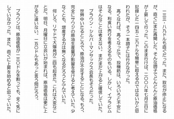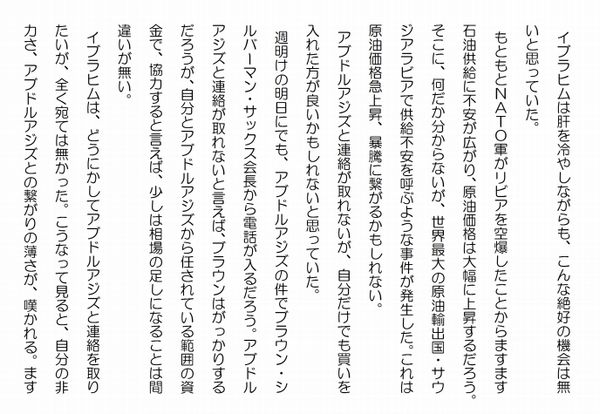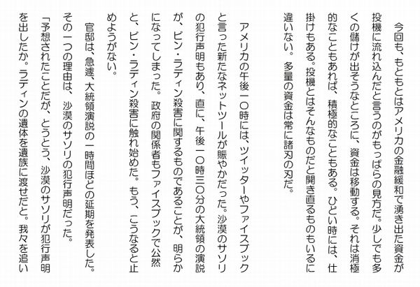 この作品はフィクションであり実在の人物団体等とは一切関係ありません。Copyright(C) 2008-2011 Kazuo KAWAHARA All rights reserved. 今回も、もともとはアメリカの金融緩和で湧き出た資金が投機に流れ込んだと言うのがもっぱらの見方だ。少しでも多くの儲けが出そうなところに、資金は移動する。それは消極的なこともあれば、積極的なこともある。ひどい時には、仕掛けもある。投機とはそんなものだと開き直るものもいるに違いない。多量の資金は常に諸刃の刃だ。 アメリカの午後一〇時には、ツイッターやファイスブックと言った新たなネットツールが賑やかだった。沙漠のサソリの犯行声明もあり、直に、午後一〇時三〇分の大統領の演説が、ビン・ラディン殺害に関するものであることが、明らかになってしまった。政府の関係者もファイスブックで公然と、ビン・ラディン殺害に触れ始めた。もう、こうなると止めようがない。 官邸は、急遽、大統領演説の一時間ほどの延期を発表した。その一つの理由は、沙漠のサソリの犯行声明だった。「予想されたことだが、とうとう、沙漠のサソリが犯行声明を出したか。ラディンの遺体を遺族に渡せだと。我々を追い詰めるだと」 オサマは、演説草稿に、この犯行声明を強く意識した部分を急遽挿入した。-しかしビン・ラディンの死が、私たちの努力が終わったことを意味しはしません。アルカイダが我々を執拗に攻撃し続けることには疑いがありません。私たちは国内でも海外でも、警戒を怠ってはならないし、警戒を怠りません 沙漠のサソリに言われるまでもない。我々は常にアルカイダ全体を意識している。そして、勿論、世界にいる全てのアメリカ人の安全も常に意識している。-従って、アメリカ人は、戦争の犠牲も理解しています。しかし、私達は国として絶対に、我々の安全保障が脅かされることに耐えられないし、我が国民が殺されるのを徒に傍観したりはしません。我が市民と我々の友人、そして同盟国を必ず防衛します。我々は、我々をして誰であるかを知らしめるような、価値に忠実に従います オサマは、満足気に、そこで腕時計を見た。時間を変更した演説まで、あと、小一時間、思いの丈を綴って行こうと、淡々と筆を進めていた。 ニューヨークのブラウンは、沙漠のサソリの犯行声明をネットで発見して愕然としていた。ビン・ラディンが殺害されたとすれば、一大事だ。 放っておけば、原油価格が大暴落だ。日曜日の夜も更けていたが、急いでアナリスト達と連絡をとって、対策を考えていた。社内はパニック状態だった。 ブラウンは、ついさっき史上最高値を更新したばかりだったと言うのに、これでは、一〇〇ドル以下も視野に入れなければいけないと、地団太を踏んでいた。 社内のアナリスト達には、リヤドのファイサリア・コンプレックス爆破事件のような報復テロが相次いで起きる恐れがあるなどと書いたり、喋ったりするよう指示を出した。