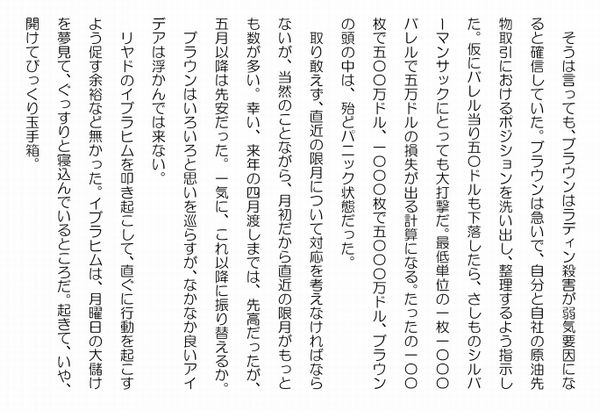 この作品はフィクションであり実在の人物団体等とは一切関係ありません。Copyright(C) 2008-2011 Kazuo KAWAHARA All rights reserved. そうは言っても、ブラウンはラディン殺害が弱気要因になると確信していた。ブラウンは急いで、自分と自社の原油先物取引におけるポジションを洗い出し、整理するよう指示した。仮にバレル当り五〇ドルも下落したら、さしものシルバーマンサックにとっても大打撃だ。最低単位の一枚一〇〇〇バレルで五万ドルの損失が出る計算になる。たったの一〇〇枚で五〇〇万ドル、一〇〇〇枚で五〇〇〇万ドル、ブラウンの頭の中は、殆どパニック状態だった。取り敢えず、直近の限月について対応を考えなければならないが、当然のことながら、月初だから直近の限月がもっとも数が多い。幸い、来年の四月渡しまでは、先高だったが、五月以降は先安だった。一気に、これ以降に振り替えるか。ブラウンはいろいろと思いを巡らすが、なかなか良いアイデアは浮かんでは来ない。リヤドのイブラヒムを叩き起こして、直ぐに行動を起こすよう促す余裕など無かった。イブラヒムは、月曜日の大儲けを夢見て、ぐっすりと寝込んでいるところだ。起きて、いや、開けてびっくり玉手箱。何人かの社内トレーダーが心配してブラウンに電話を入れて来た。まだ、暗殺情報が広まっていない今の内に、売り抜いた方が良いのではないかと言う者が殆どだった。ブラウンは直ぐに、そうするよう指示した。しかし、そう判断したのはブラウン達だけではなかった。情報入手の早い投機筋は皆一斉に売りに出た。ものの数分で、原油価格は一五〇ドルを割り込んだ。そうなると、下落の勢いは加速されるばかりだ。特にアジアは既に午前の取引が始まっていて、絶好の時間帯だ。取引枚数は少なく、本格的動きはヨーロッパ、アメリカの参加者が主になってからにしても、動き易い。アジア市場では、ラディン殺害のニュースが流れ、原油価格は低下を続けた。一四〇ドル、一三〇ドルは、見る見る内だった。こんな時に、報復テロの噂さを流したところで、焼け石に水だ。 原油価格高騰を懸念していたオサマ・アメリカ大統領は、一転、原油価格が大幅に低下を始めたことで胸を撫で下ろしていた。もう直ぐ、演説の時間だ。演説をすれば、更に原油価格が低下するに違いない。オサマはそう思っていた。 -こんばんは。今夜、私は、アメリカ国民と世界に対し・・・ 午後一一時三五分、オサマの演説は始まった。日本では午前一二時三五分、この演説を受け、原油価格は更に大幅に下げた。中国、シンガポールなどの投機筋も一斉に原油を売りに出したからだ。誰も損失を最小限にしたいと必死なのだ。 スルタンとアブドルアジズは断崖の城にいた。 今日も、城の周囲は霧に包まれていた。霧の間を縫うように大鷹が飛んでいる。リヤドとタイフが中心のアブドルアジズには、薄気味悪い光景だった。アルバハのシェイク家のスルタンは、こんな光景の中にいると、リヤドの時とは異なり、より迫力を増していた。悠久の時代に、この地で生活を始めた先祖は、霊的能力をもって部族を纏めた。時代は変わったが、その力がスルタンに漲っているように見えてくる。