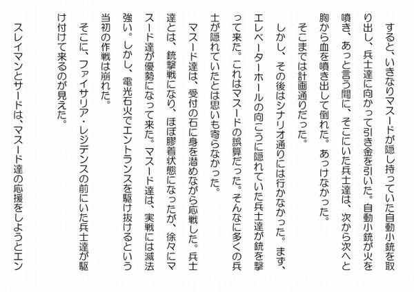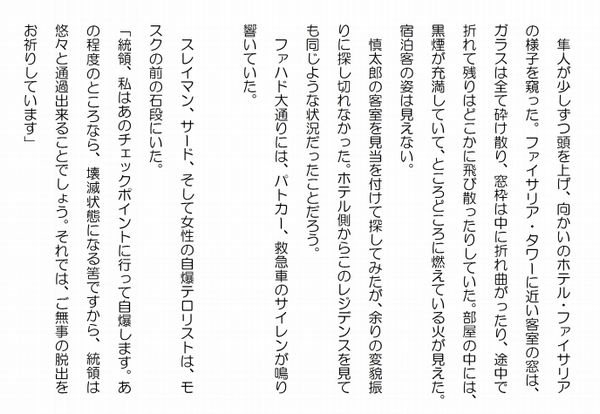 この作品はフィクションであり実在の人物団体等とは一切関係ありません。Copyright(C) 2008-2011 Kazuo KAWAHARA All rights reserved. すると、いきなりマスードが隠し持っていた自動小銃を取り出し、兵士達に向かって引き金を引いた。自動小銃が火を噴き、あっと言う間に、そこにいた兵士達は、次から次へと胸から血を噴き出して倒れた。あっけなかった。 そこまでは計画通りだった。 しかし、その後はシナリオ通りには行かなかった。まず、エレベーターホールの向こうに隠れていた兵士達が銃を撃って来た。これはマスードの誤算だった。そんなに多くの兵士が隠れていたとは思いも寄らなかった。マスード達は、受付の石に身を潜めながら応戦した。兵士達とは、銃撃戦になり、ほぼ膠着状態になったが、徐々にマスード達が優勢になって来た。マスード達は、実戦には滅法強い。しかし、電光石火でエントランスを駆け抜けるという当初の作戦は崩れた。 そこに、ファイサリア・レジデンスの前にいた兵士達が駆け付けて来るのが見えた。 スレイマンとサードは、マスード達の応援をしようとエントランスに入ろうとしたが、そこにさっきの自爆テロリストの女性が駆け付けて来て、二人を制止した。「統領、どうかお逃げ下さいませ。マスード様達はエントランスで最後まで戦われるおつもりです。脚元を爆破することはお諦めになりました。いちかばちか、エントランスで仲間に自爆してもらい、ファイサリア・タワーに少しでも大きな損傷を与えたいとのことでございます」 スレイマンがエントランスを覗くと、マスードが遠くからスレイマンにVサインを送っていた。笑顔だった。スレイマンも笑顔で応えたかったが、顔が強張っているのが分かった。それでも、無理やり笑顔を作り、スレイマンが頷くのを見届けると、連絡通路をモスク側へと走り始めた。目に無念の涙が流れるのを止めることは出来なかった。 スレイマン、サード、そして女性の自爆テロリストの三人が連絡通路の端に着くと同時に、大音響がして、爆風が勢い良く、エントランスから通路へと吹き上げるのが見えた。凄まじい爆発だった。 レジデンスの前から駆け付けた兵士達は、その爆発に巻き込まれて誰一人として生き残るものはいなかったに違いない。エントランスは黒煙に包まれた。 隼人達は、シュルツの部屋でその大音響を聞き、爆風を目撃した。皆、床に臥したが、その背中に爆風で粉々になった窓ガラスが降り掛かった。レジデンスは大きく揺れた。「しまった。沙漠のサソリがファイサリア・タワー爆破を図ったようだ。ファイサリア・タワーが大きく揺れている」 シュルツの部屋からはファイサリア・タワーが丸見えだ。エントランスも直ぐ目の前だった。「エントランス・ホールは壊滅状態だ。大きな穴が開いているのも見える。ファハド大通りからはパトカーのサイレンが聞こえる。ただ、兵士達は、皆、爆発で即死状態だったようだ。ファイサリアのガードマンが生き残っているが、彼等は銃器を持ってはいないし、ただ、右往左往しているだけだ」 隼人達は、レジデンスのエントランス近くに、主人を無くした装甲車が空しく置かれているのを眺めていた。「慎太郎は無事だろうか。彼の部屋はエントランスが近い」